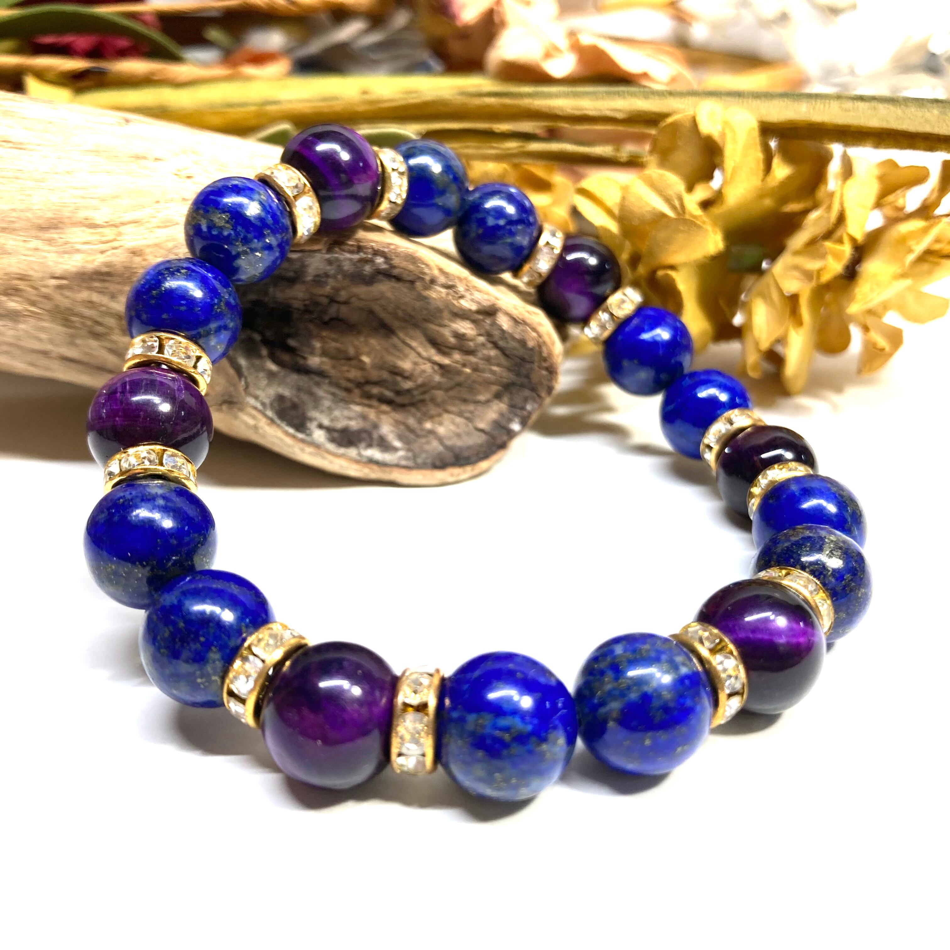 こちらは、ラピスラズリとパープル タイガーアイを組み合わせたパワーストーンブレスレットです。間にはロンデルを挟み高級感あるデザインに仕上げております。石大きさは腕にも馴染みやすいように10mm玉で内径約18cm(伸可能)です。 数に限りがございますので気になる方はお早めにどうぞ。