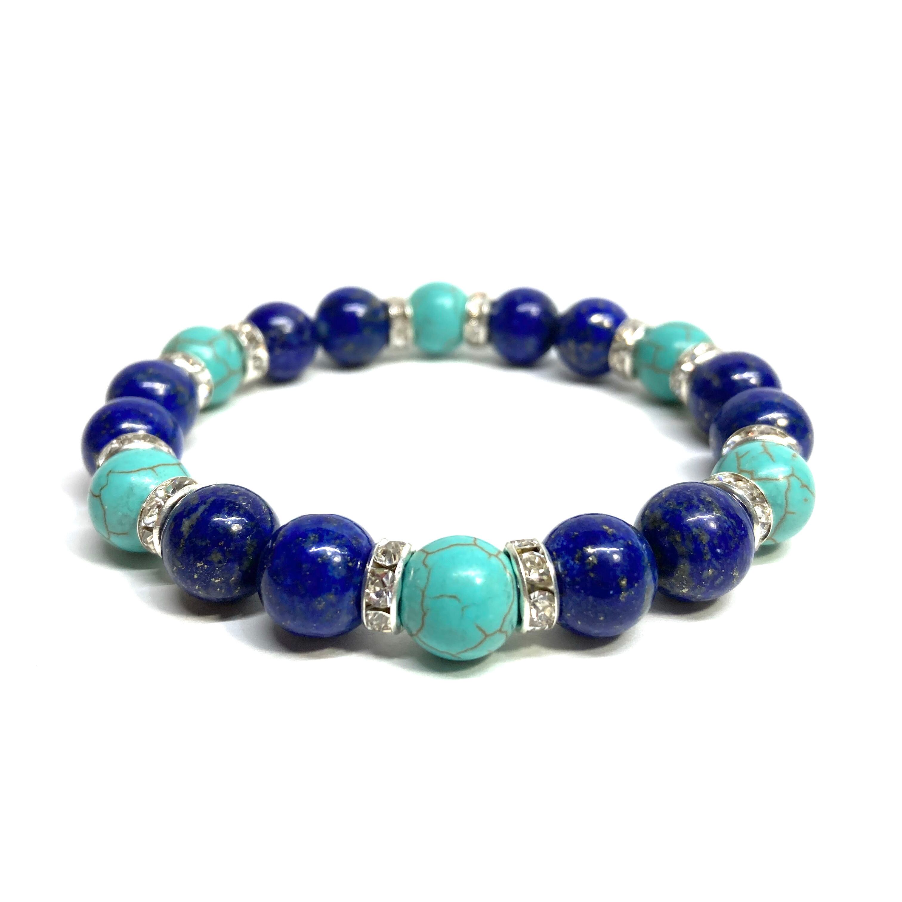 こちらは、ラピスラズリとターコイズを組み合わせたパワーストーンブレスレットです。間にはロンデルを挟み高級感あるデザインに仕上げております。石大きさは腕にも馴染みやすいように10mm玉で内径約18cm(伸可能)です。 数に限りがございますので気になる方はお早めにどうぞ。