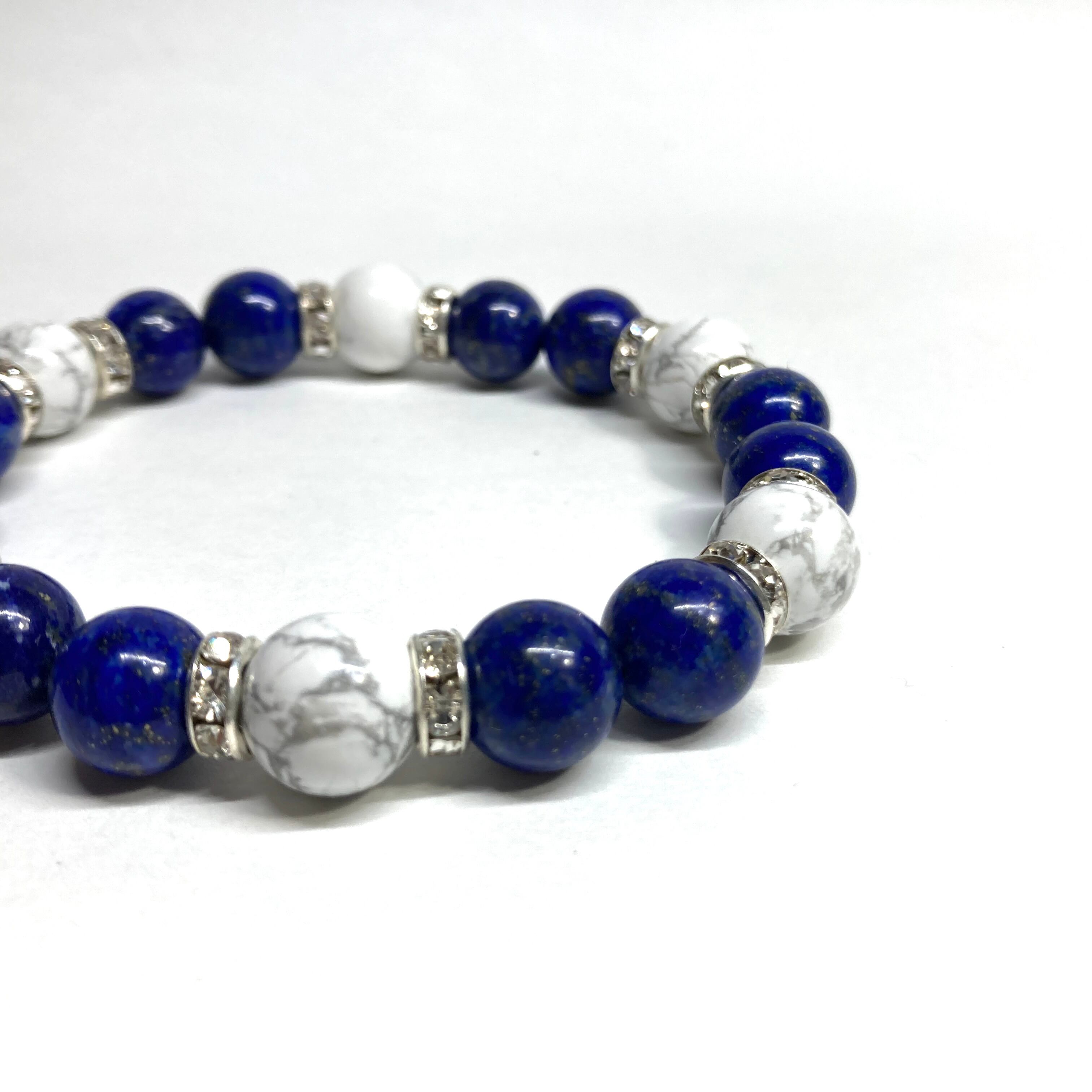 こちらは、ラピスラズリとハウライトを組み合わせたパワーストーンブレスレットです。間にはロンデルを挟み高級感あるデザインに仕上げております。石大きさは腕にも馴染みやすいように10mm玉で内径約18cm(伸可能)です。 数に限りがございますので気になる方はお早めにどうぞ。