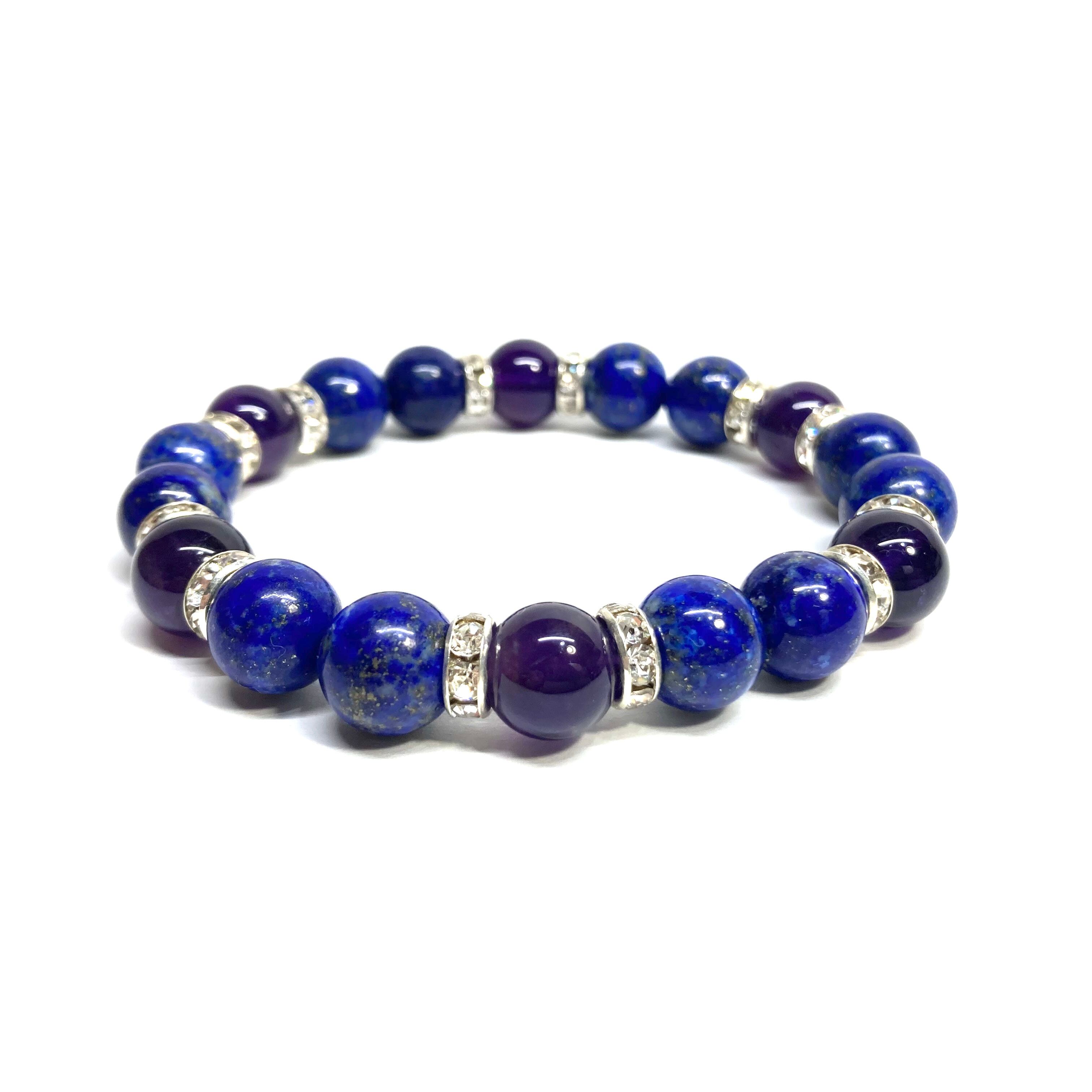 こちらは、ラピスラズリとアメジストを組み合わせたパワーストーンブレスレットです。間にはロンデルを挟み高級感あるデザインに仕上げております。石大きさは腕にも馴染みやすいように10mm玉で内径約18cm(伸可能)です。 数に限りがございますので気になる方はお早めにどうぞ。
