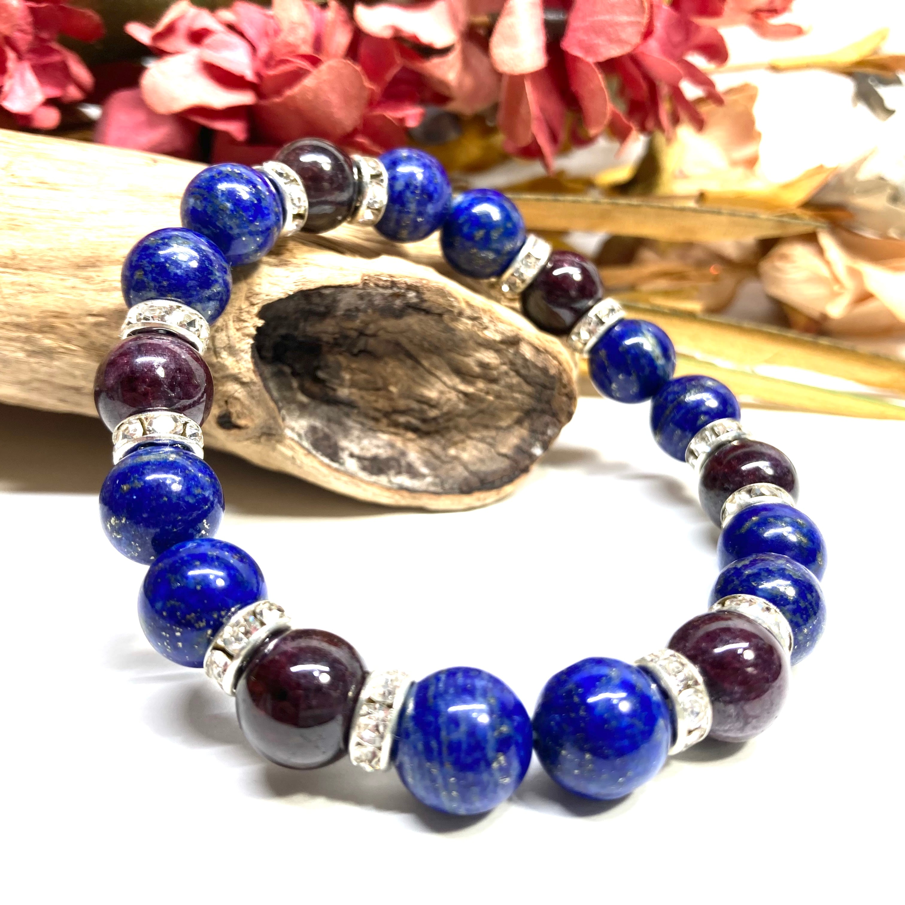 こちらは、ラピスラズリとガーネットを組み合わせたパワーストーンブレスレットです。間にはロンデルを挟み高級感あるデザインに仕上げております。石大きさは腕にも馴染みやすいように10mm玉で内径約18cm(伸可能)です。 数に限りがございますので気になる方はお早めにどうぞ。