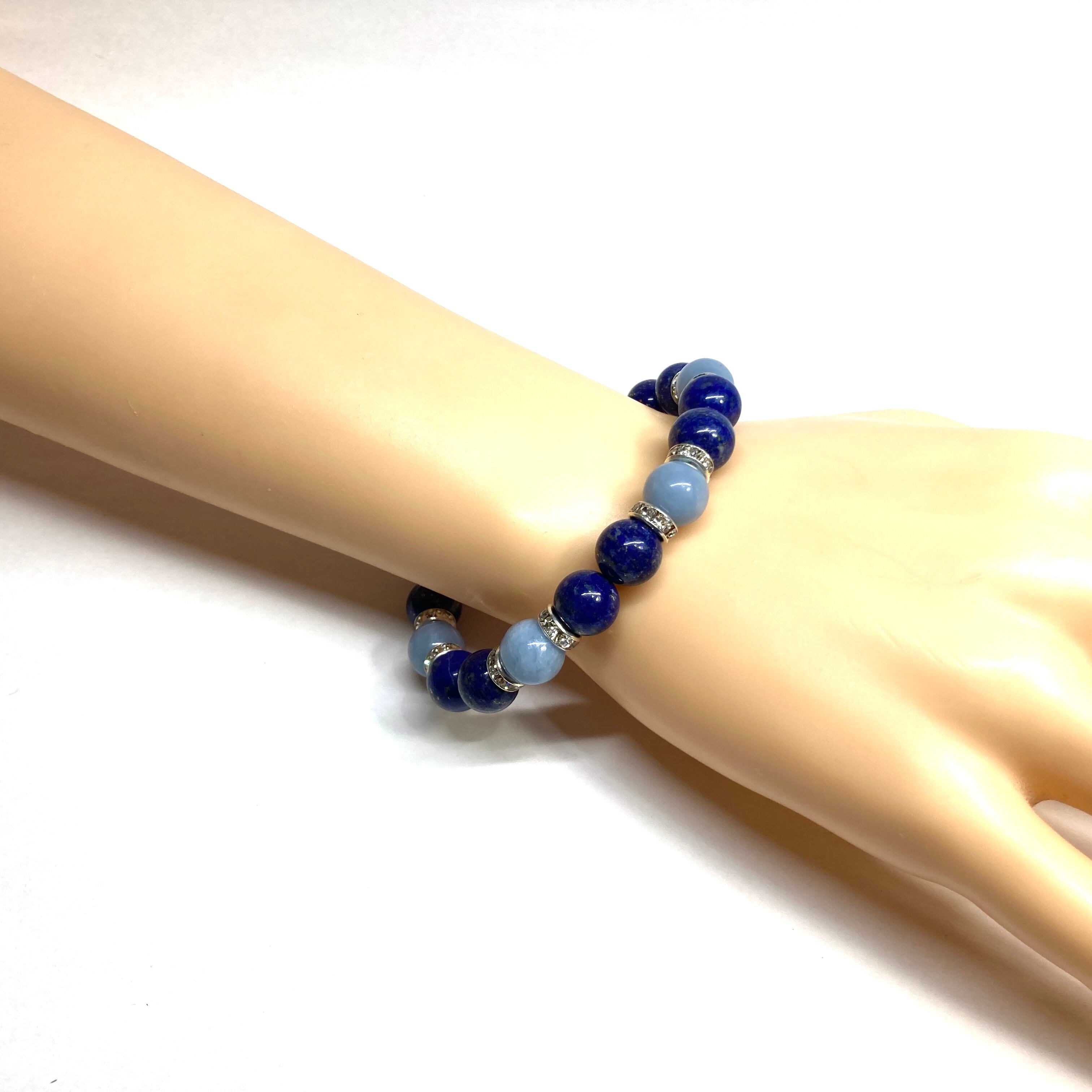 こちらは、ラピスラズリとエンジェライトを組み合わせたパワーストーンブレスレットです。間にはロンデルを挟み高級感あるデザインに仕上げております。石大きさは腕にも馴染みやすいように10mm玉で内径約18cm(伸可能)です。 数に限りがございますので気になる方はお早めにどうぞ。