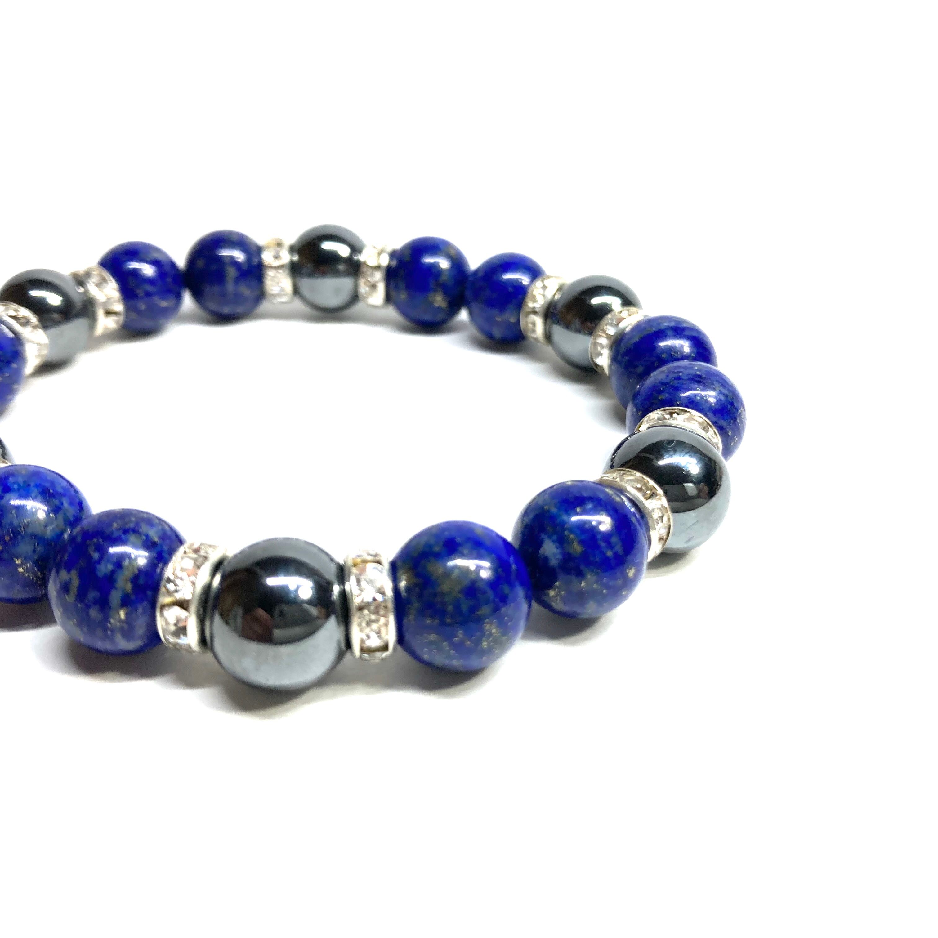 こちらは、ラピスラズリとヘマタイトを組み合わせたパワーストーンブレスレットです。間にはロンデルを挟み高級感あるデザインに仕上げております。石大きさは腕にも馴染みやすいように10mm玉で内径約18cm(伸可能)です。 数に限りがございますので気になる方はお早めにどうぞ。