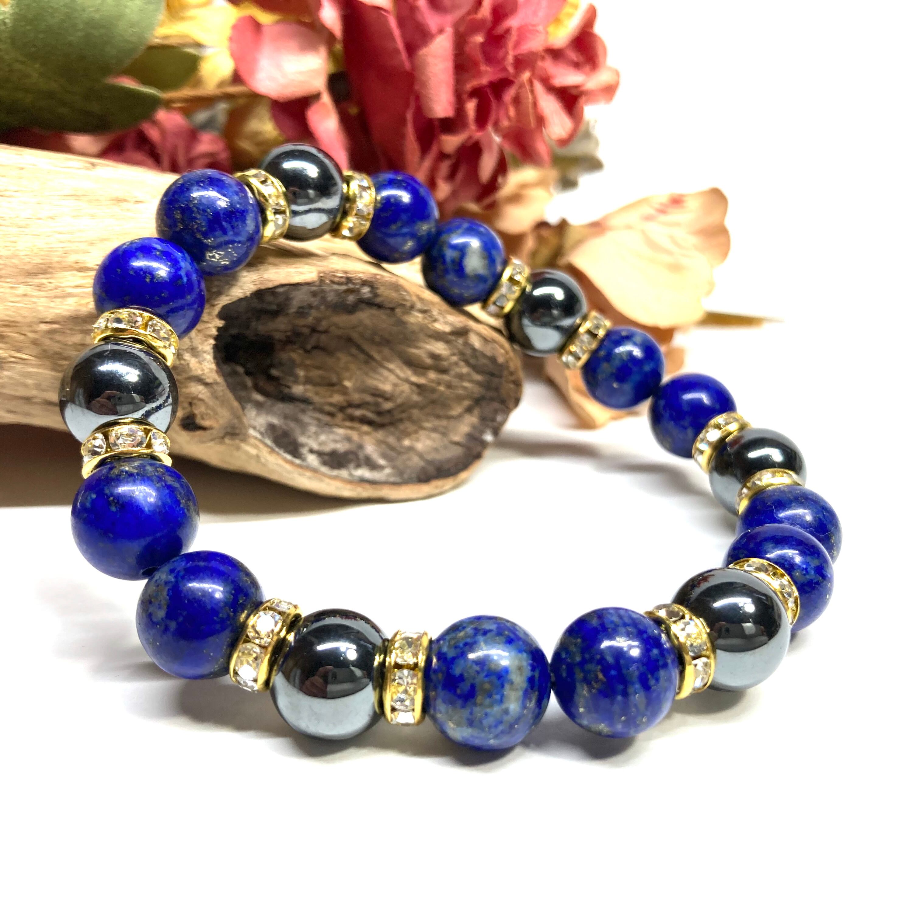 こちらは、ラピスラズリとヘマタイトを組み合わせたパワーストーンブレスレットです。間にはロンデルを挟み高級感あるデザインに仕上げております。石大きさは腕にも馴染みやすいように10mm玉で内径約18cm(伸可能)です。 数に限りがございますので気になる方はお早めにどうぞ。