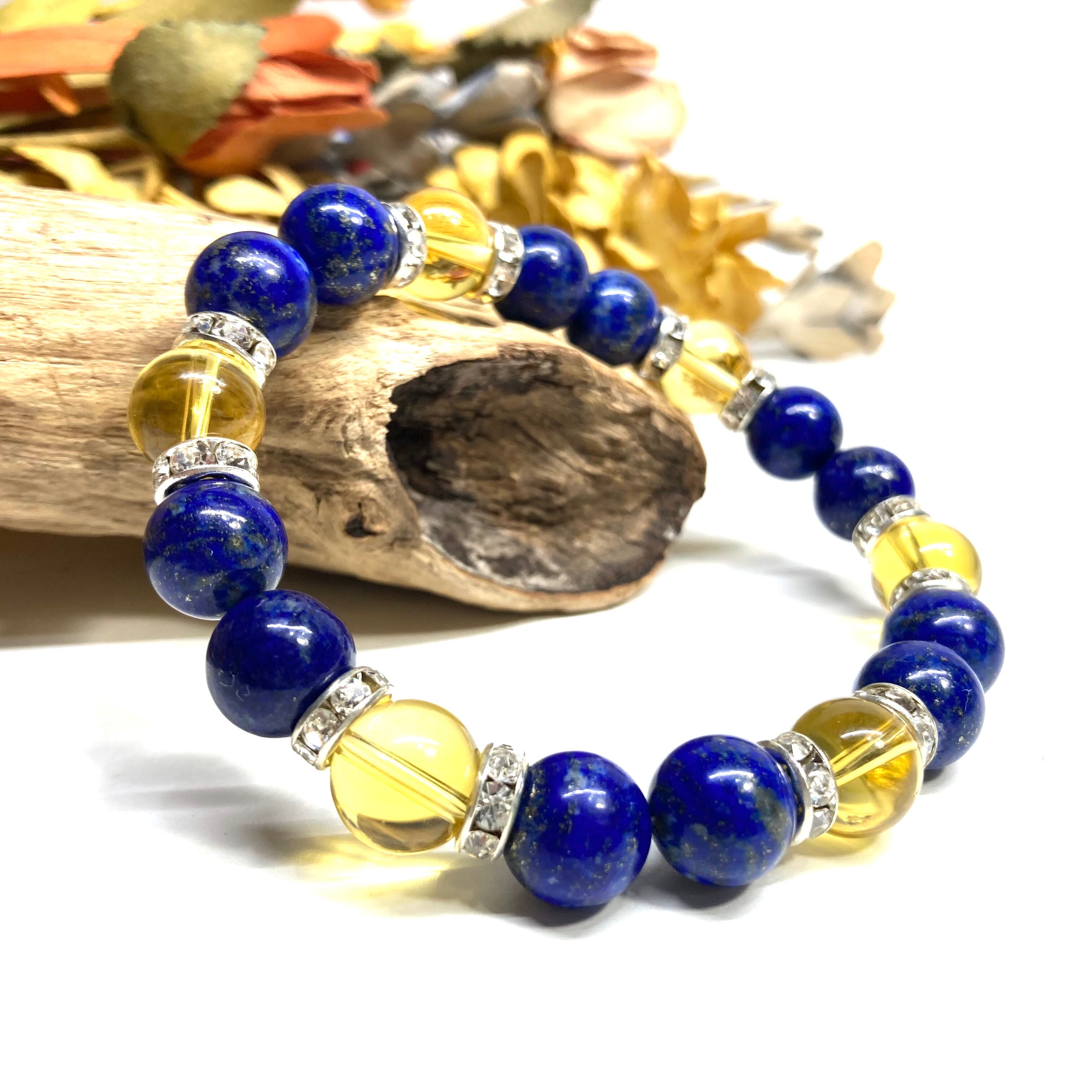 こちらは、ラピスラズリとシトリンを組み合わせたパワーストーンブレスレットです。間にはロンデルを挟み高級感あるデザインに仕上げております。石大きさは腕にも馴染みやすいように10mm玉で内径約18cm(伸可能)です。 数に限りがございますので気になる方はお早めにどうぞ。