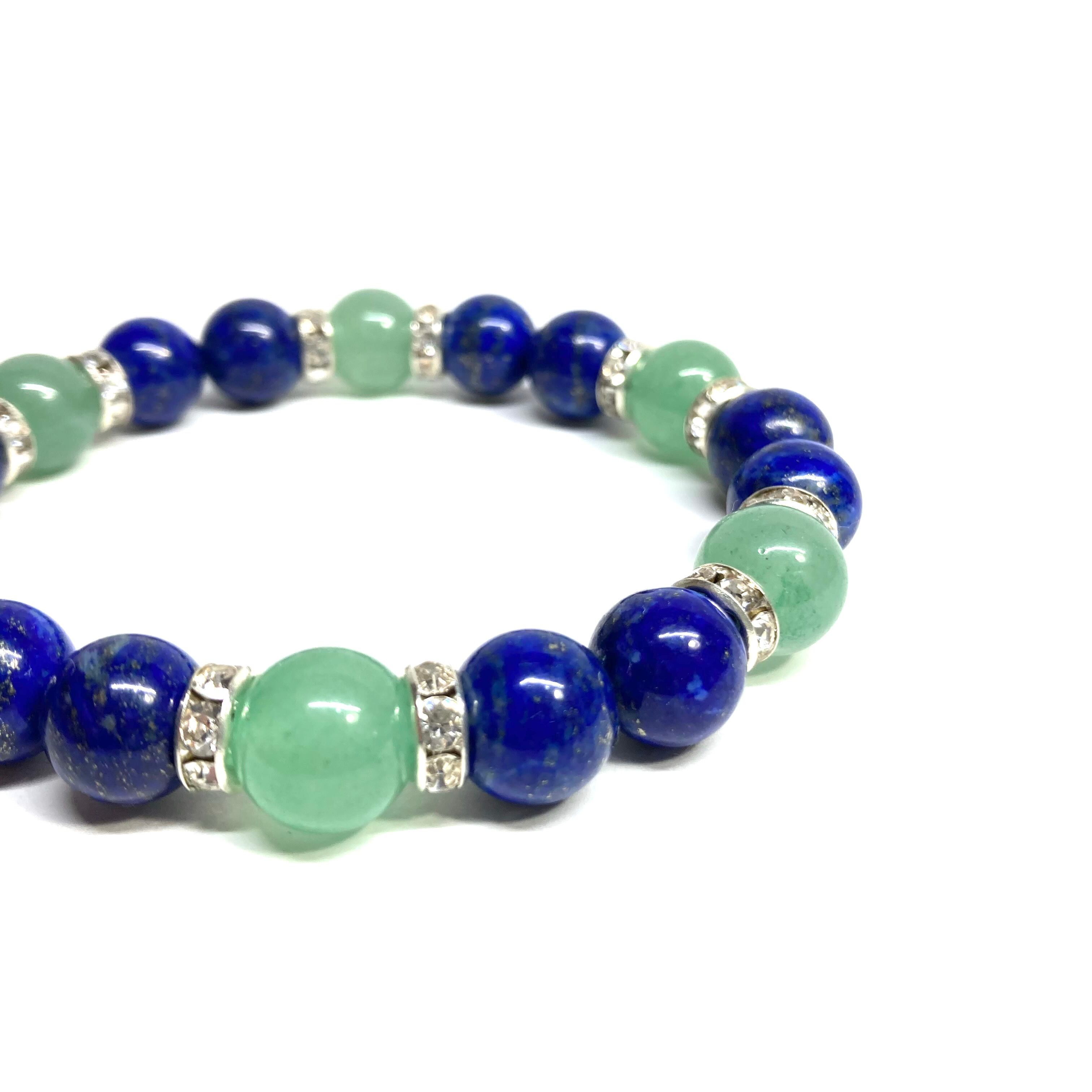 こちらは、ラピスラズリとアベンチュリンを組み合わせたパワーストーンブレスレットです。間にはロンデルを挟み高級感あるデザインに仕上げております。石大きさは腕にも馴染みやすいように10mm玉で内径約18cm(伸可能)です。 数に限りがございますので気になる方はお早めにどうぞ。