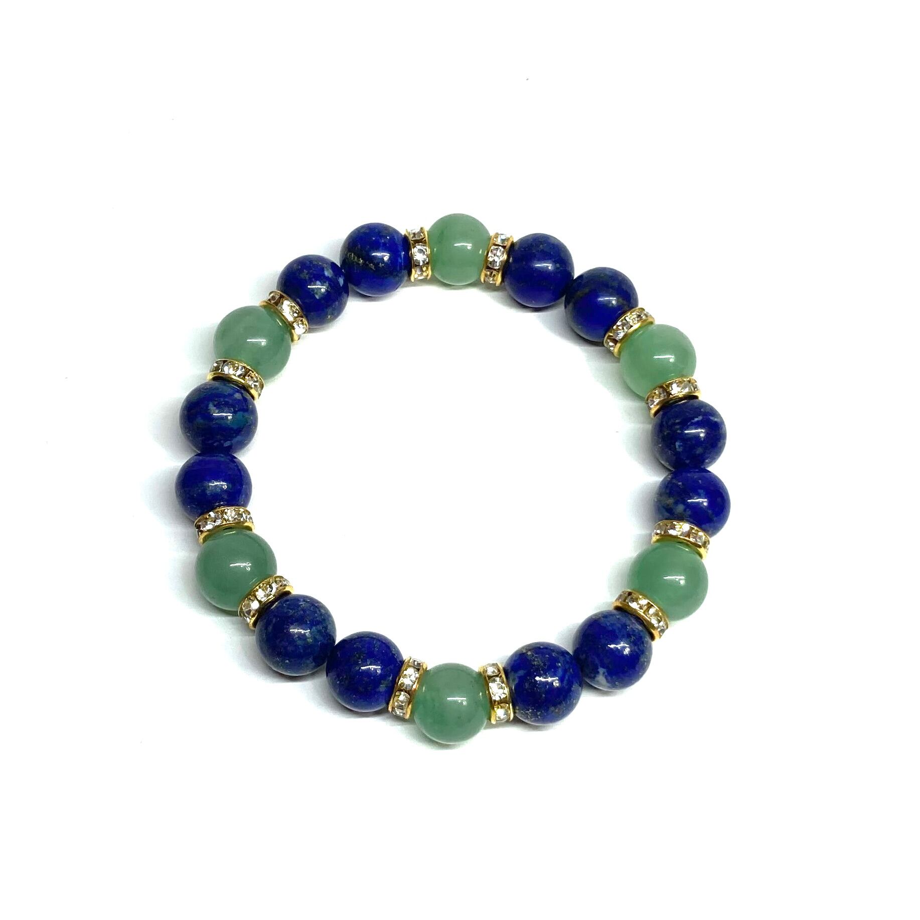 こちらは、ラピスラズリとアベンチュリンを組み合わせたパワーストーンブレスレットです。間にはロンデルを挟み高級感あるデザインに仕上げております。石大きさは腕にも馴染みやすいように10mm玉で内径約18cm(伸可能)です。 数に限りがございますので気になる方はお早めにどうぞ。
