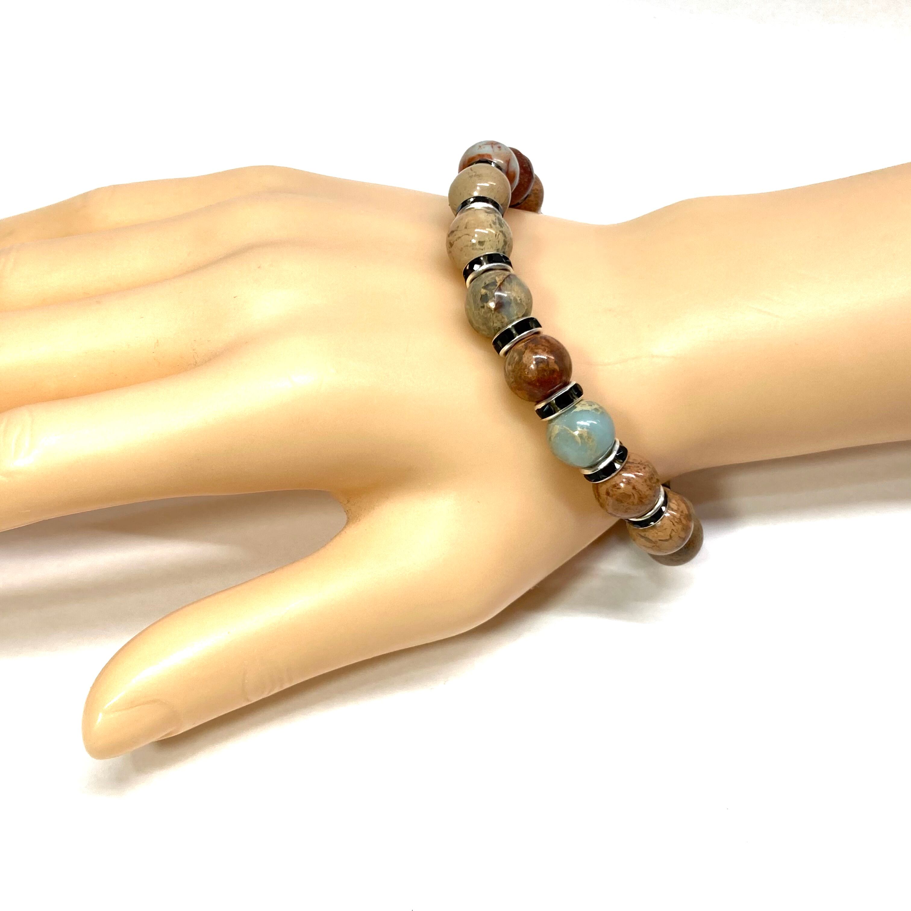 こちらは、インプレッションストーンの10mm玉を使用したパワーストーンブレスレットです。石との間にはロンデルを挟み高級感を演出しております。シンプルなデザインは、シーン問わずどんなコーディネートとも合わせ易いブレスレットです。サイズは種類を選択からお選びください。(内周約14cm?内周約22cmでお選び頂けます)当社の中でも一番人気の実績があるデザインとなっております。気になる方はお早めにどうぞ。