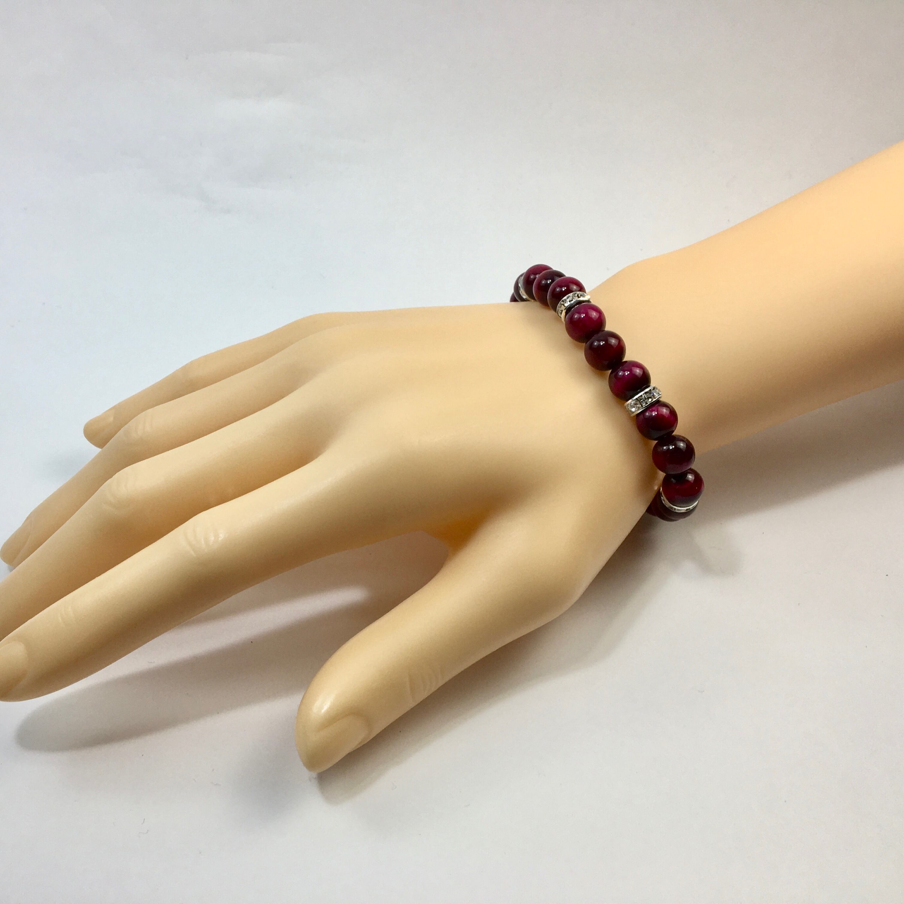こちらは、8mm玉のピンクタイガーアイを使ったパワーストーンブレスレットです。シンプルなデザインでどんなコーディネートにも合わせやすいデザインに仕上げています。サイズは内周約15cmです。気になる方は是非この機会にどうぞ。
