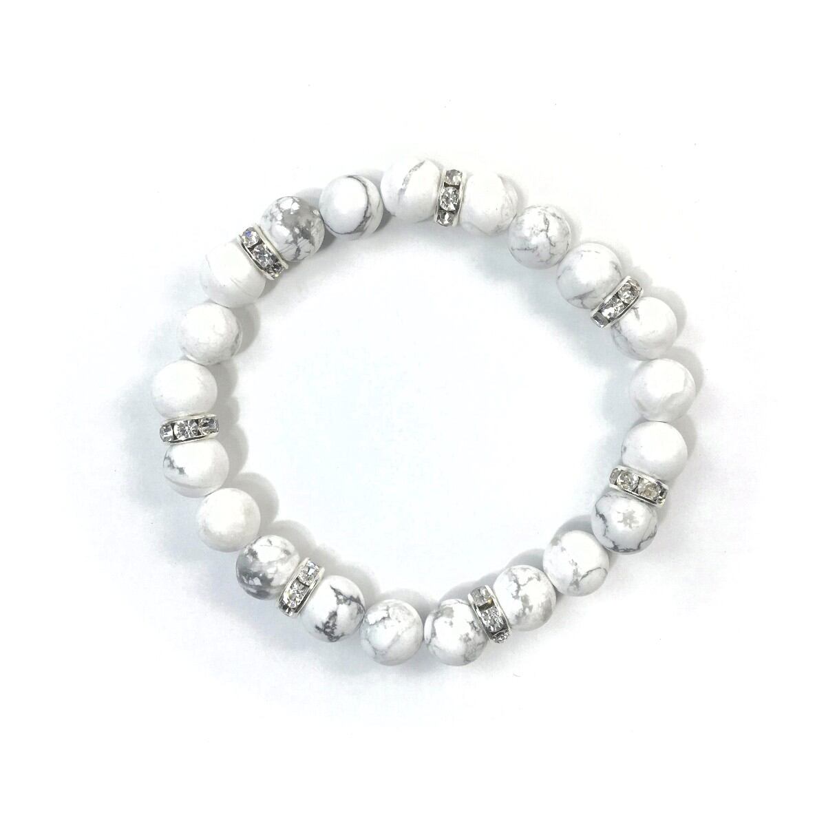 こちらは、8mm玉のハウライトを使ったパワーストーンブレスレットです。シンプルなデザインでどんなコーディネートにも合わせやすいデザインに仕上げています。サイズは内周約15cmです。気になる方は是非この機会にどうぞ。