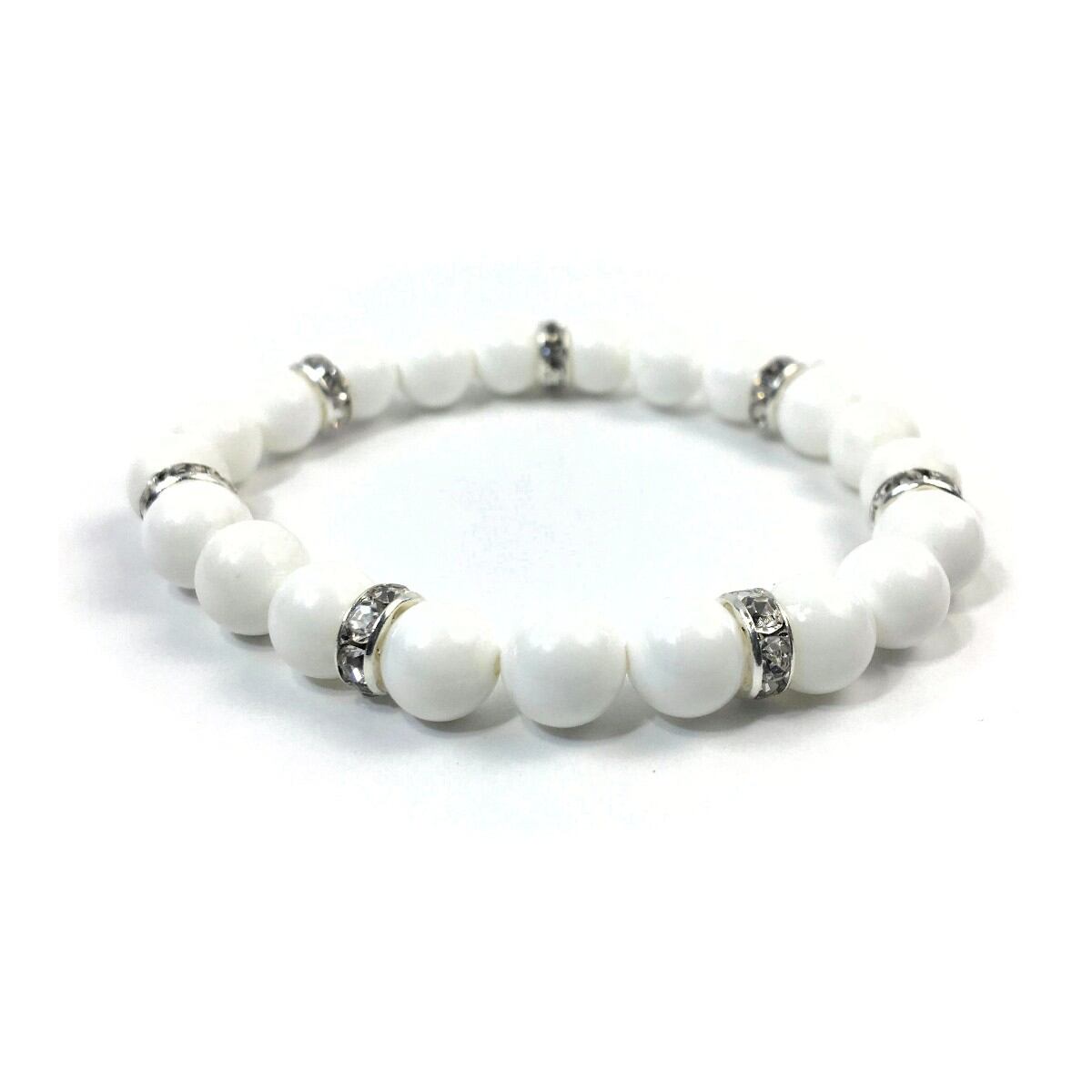 こちらは、8mm玉のホワイトオニキスを使ったパワーストーンブレスレットです。シンプルなデザインでどんなコーディネートにも合わせやすいデザインに仕上げています。サイズは内周約15cmです。気になる方は是非この機会にどうぞ。