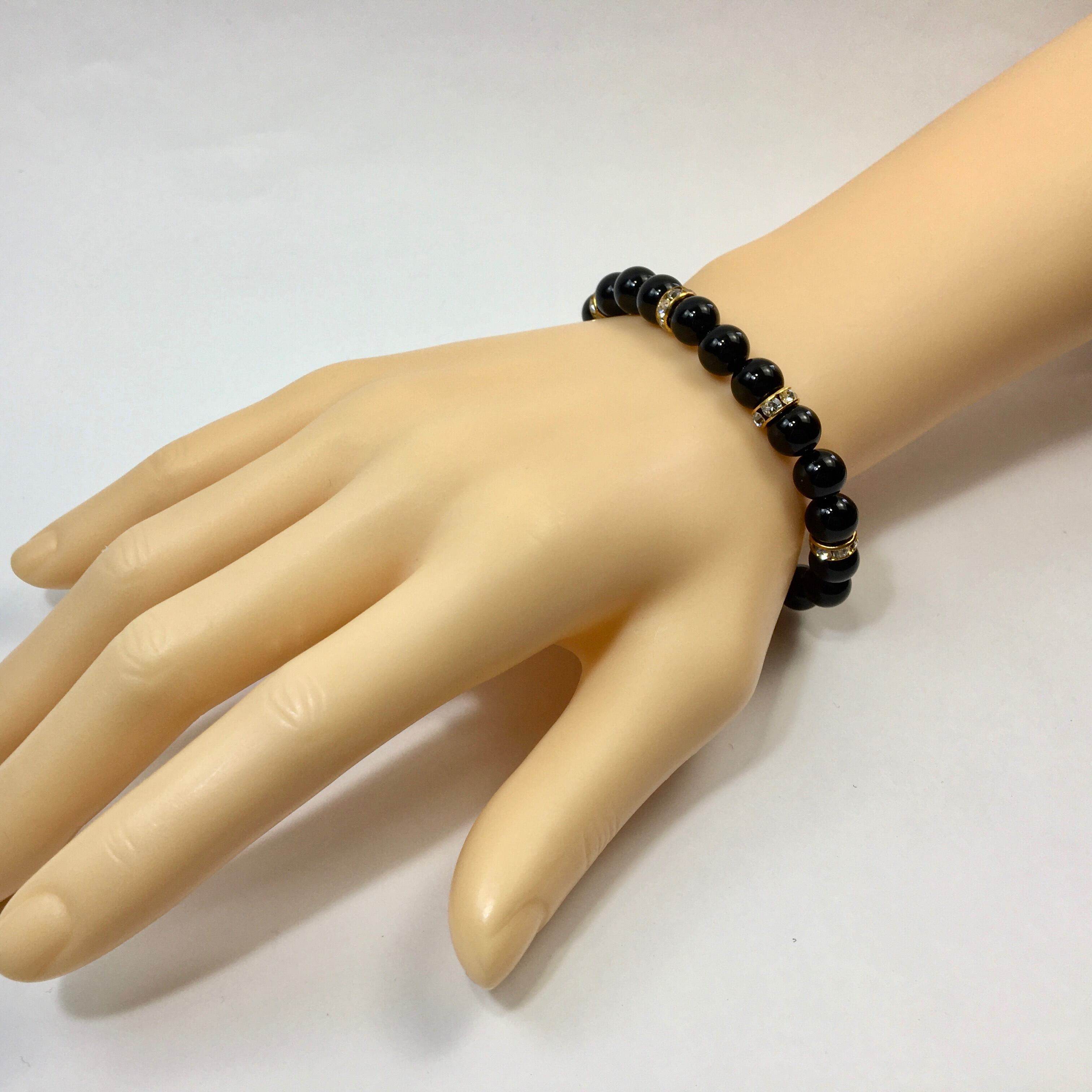 こちらは、8mm玉のオニキスを使ったパワーストーンブレスレットです。シンプルなデザインでどんなコーディネートにも合わせやすいデザインに仕上げています。サイズは内周約15cmです。気になる方は是非この機会にどうぞ。