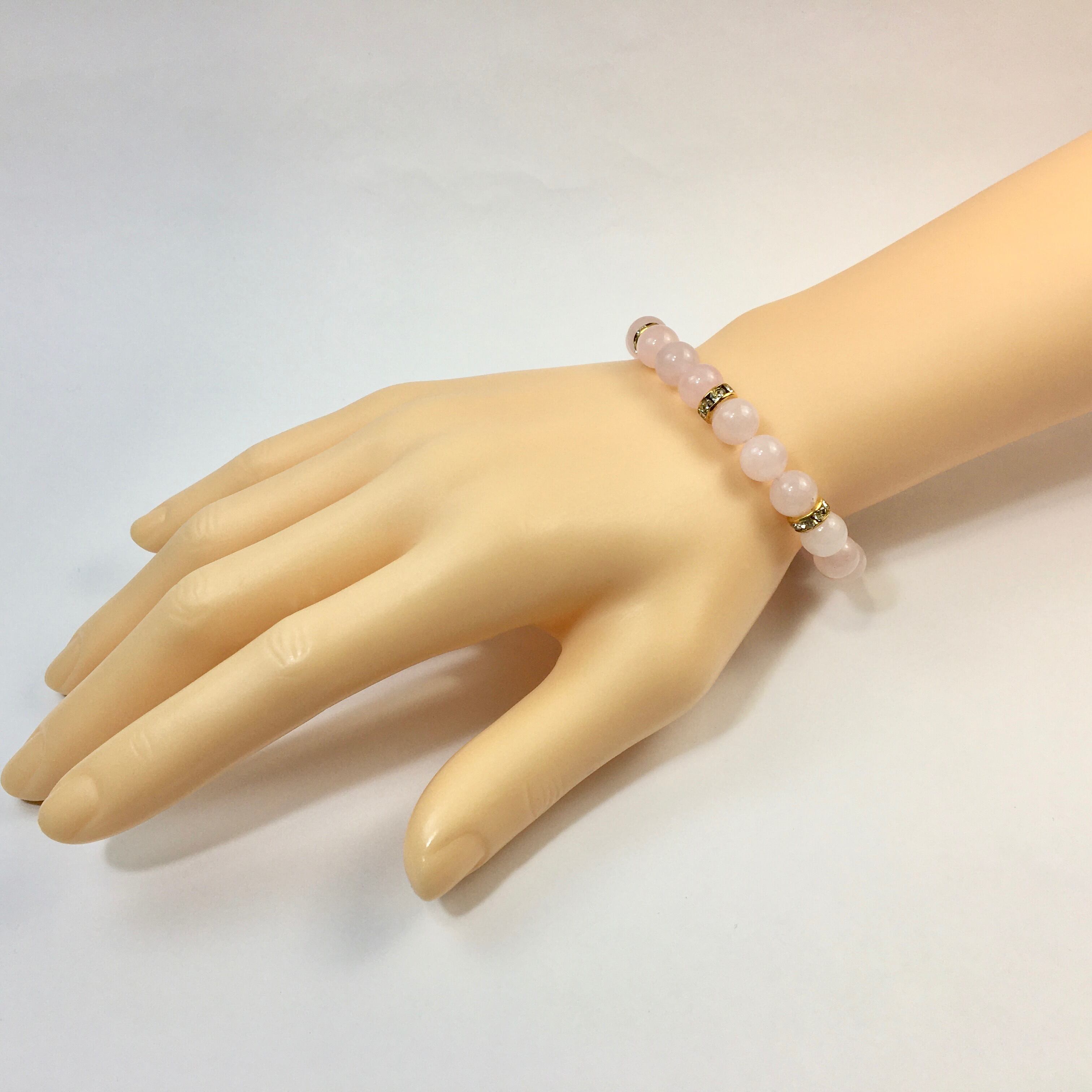 こちらは、8mm玉のローズクォーツを使ったパワーストーンブレスレットです。シンプルなデザインでどんなコーディネートにも合わせやすいデザインに仕上げています。サイズは内周約15cmです。気になる方は是非この機会にどうぞ。