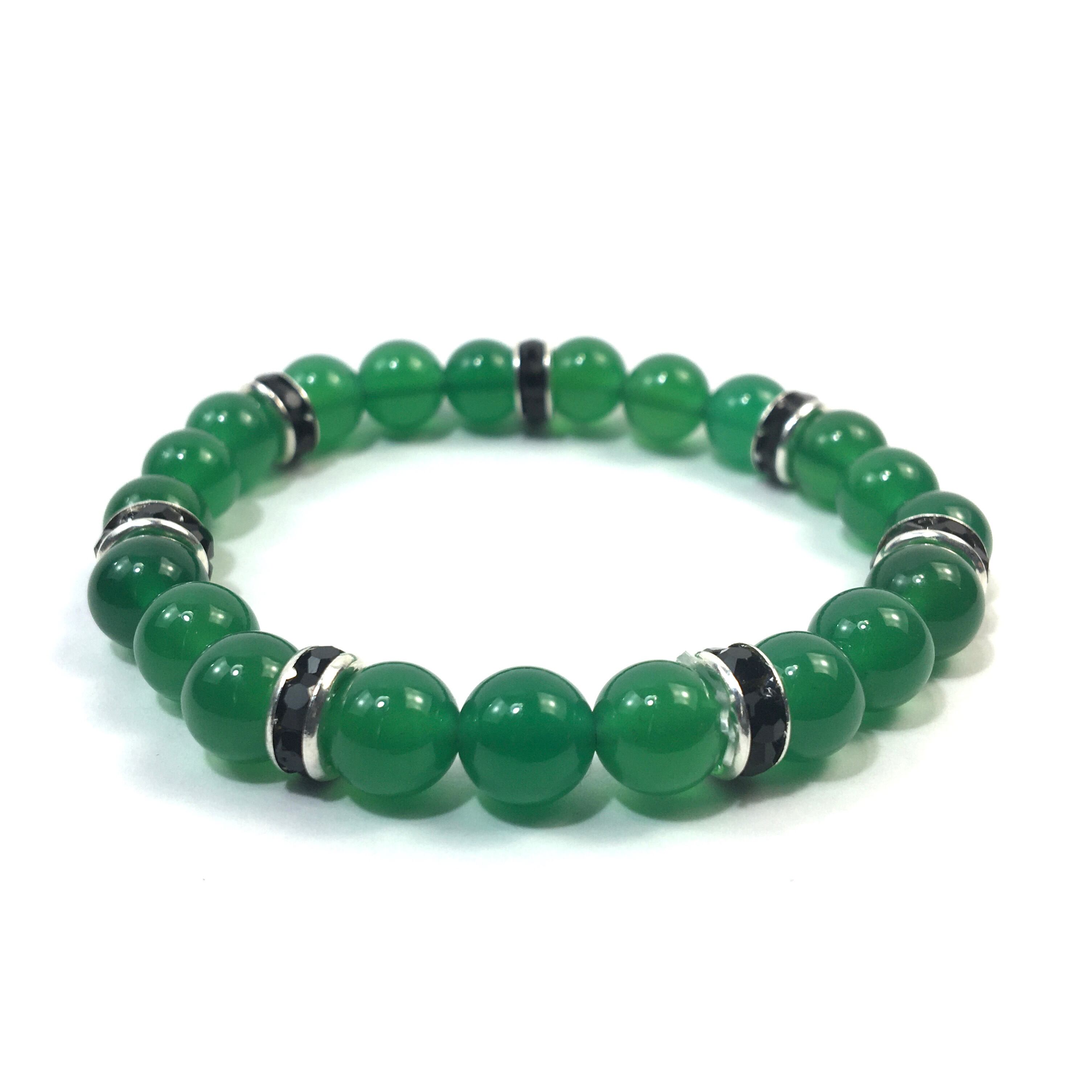 こちらは、8mm玉の緑瑪瑙を使ったパワーストーンブレスレットです。シンプルなデザインでどんなコーディネートにも合わせやすいデザインに仕上げています。サイズは内周約15cmです。気になる方は是非この機会にどうぞ。