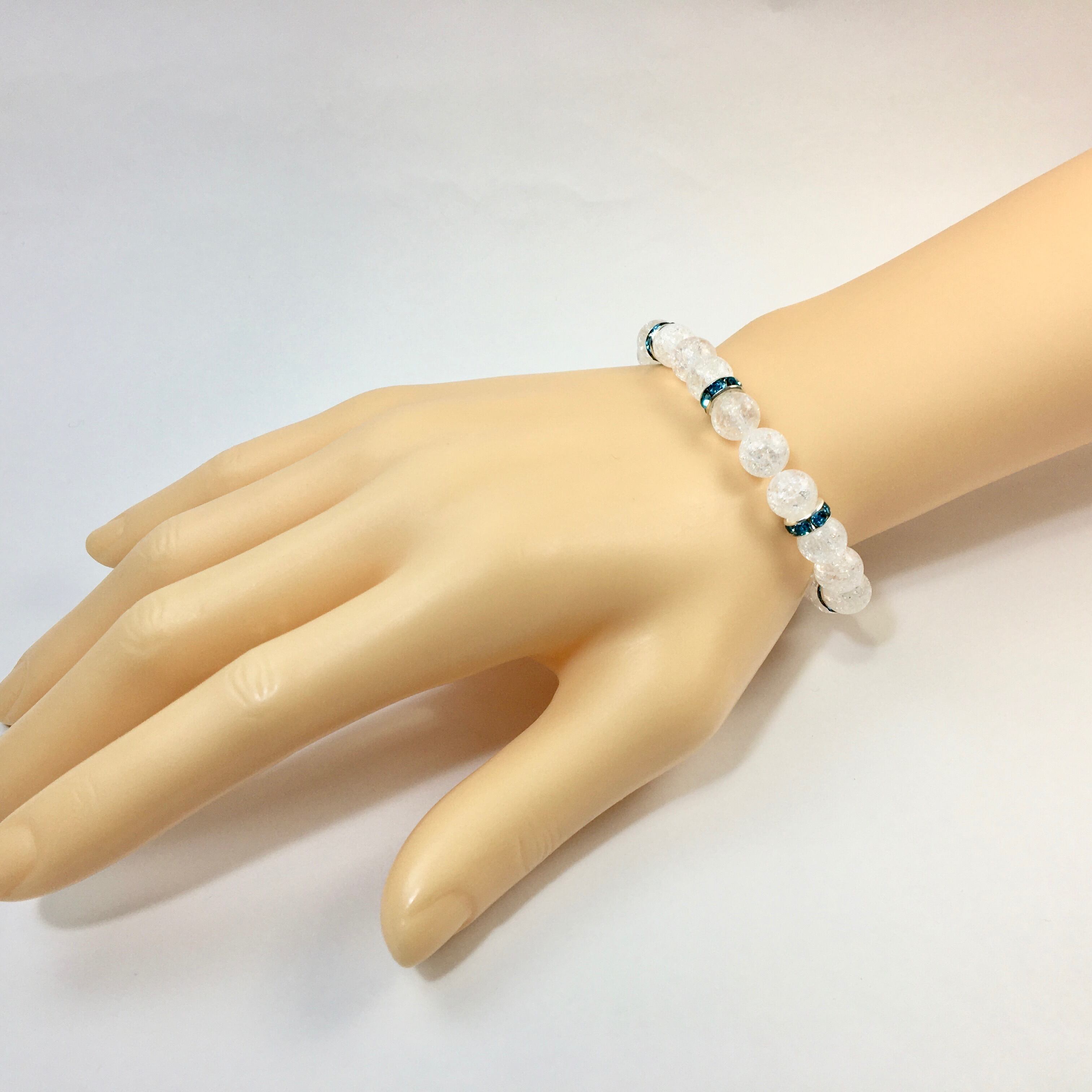こちらは、8mm玉のクラック水晶を使ったパワーストーンブレスレットです。シンプルなデザインでどんなコーディネートにも合わせやすいデザインに仕上げています。サイズは内周約15cmです。気になる方は是非この機会にどうぞ。
