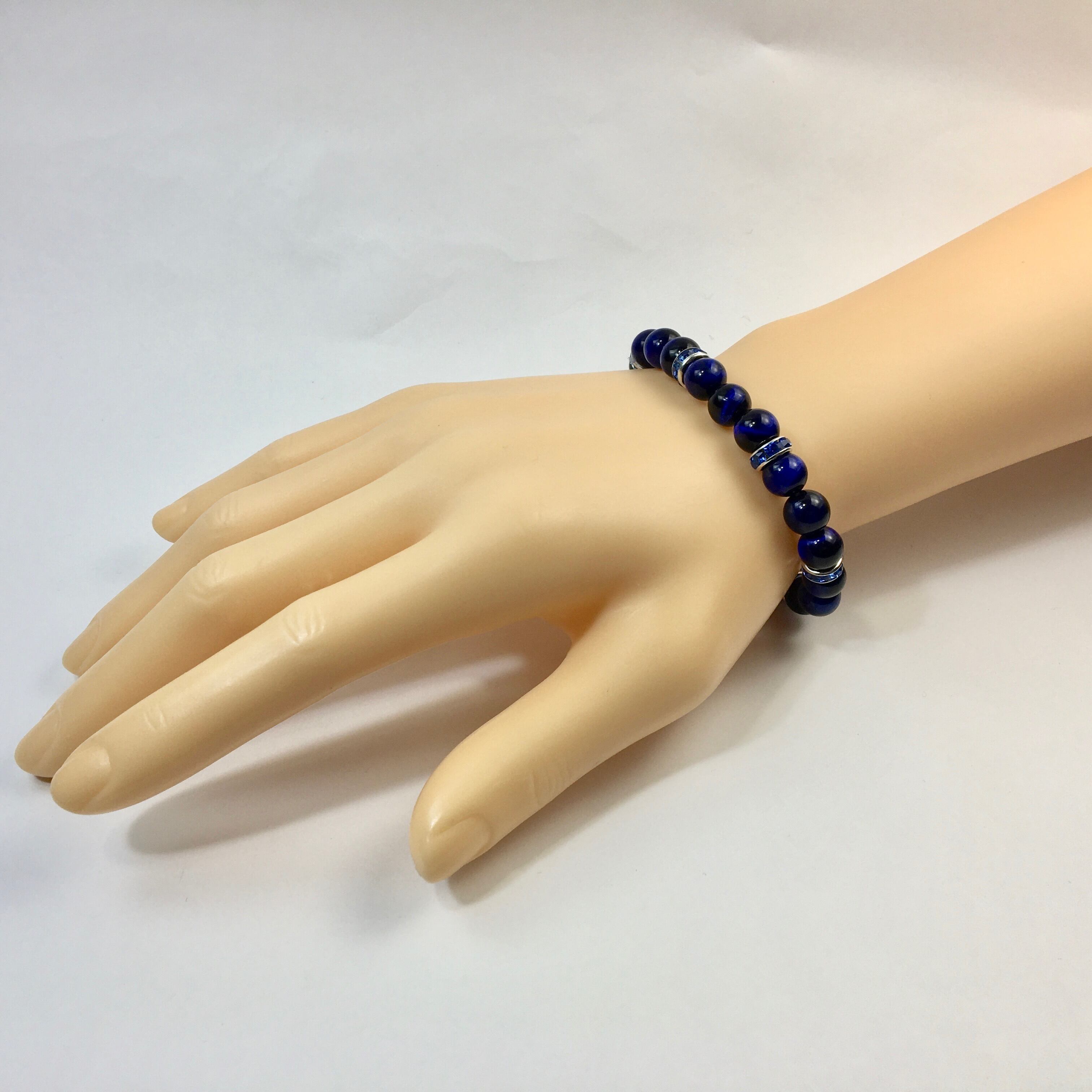 こちらは、8mm玉のブルータイガーアイを使ったパワーストーンブレスレットです。シンプルなデザインでどんなコーディネートにも合わせやすいデザインに仕上げています。サイズは内周約15cmです。気になる方は是非この機会にどうぞ。