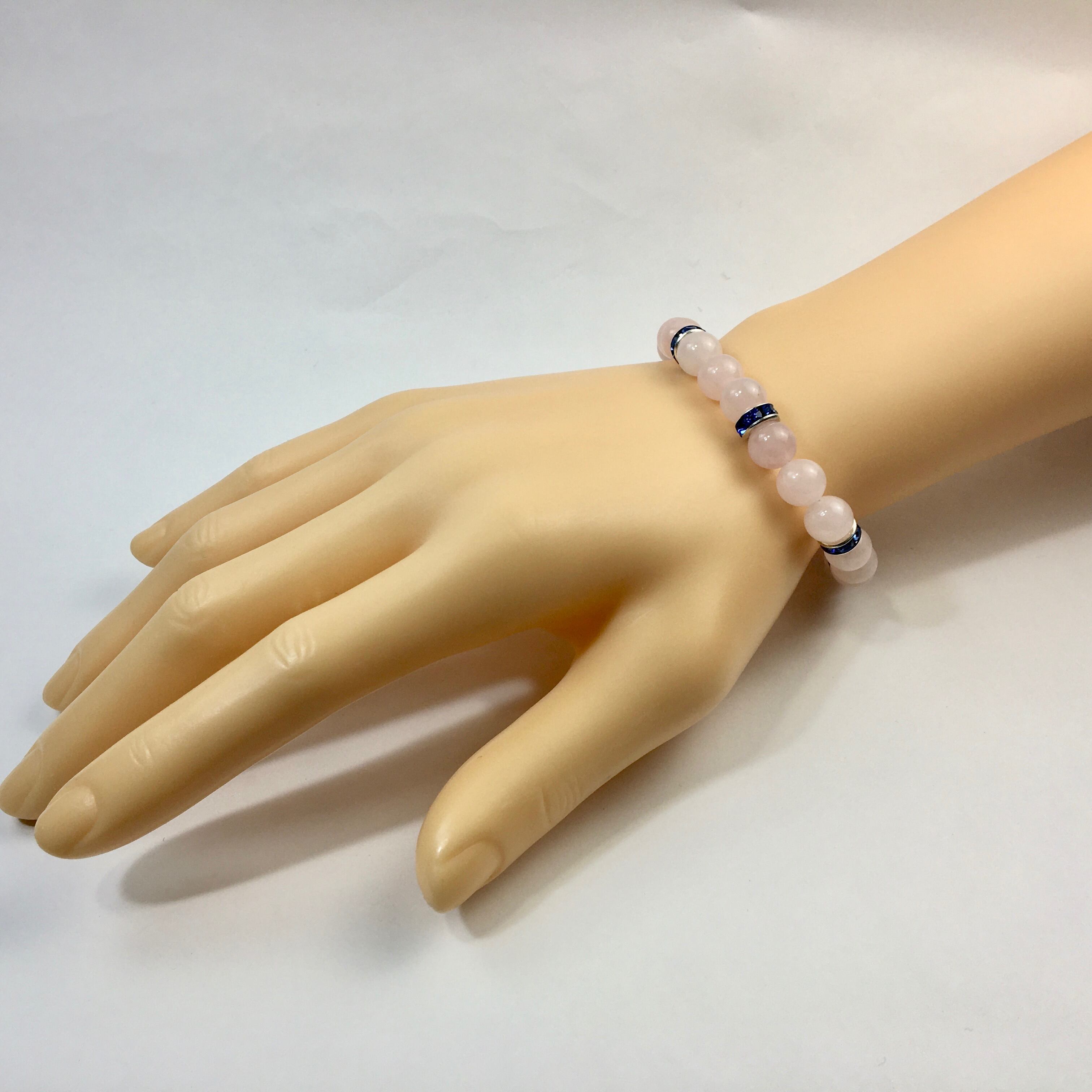 こちらは、8mm玉のローズクォーツを使ったパワーストーンブレスレットです。シンプルなデザインでどんなコーディネートにも合わせやすいデザインに仕上げています。サイズは内周約15cmです。気になる方は是非この機会にどうぞ。