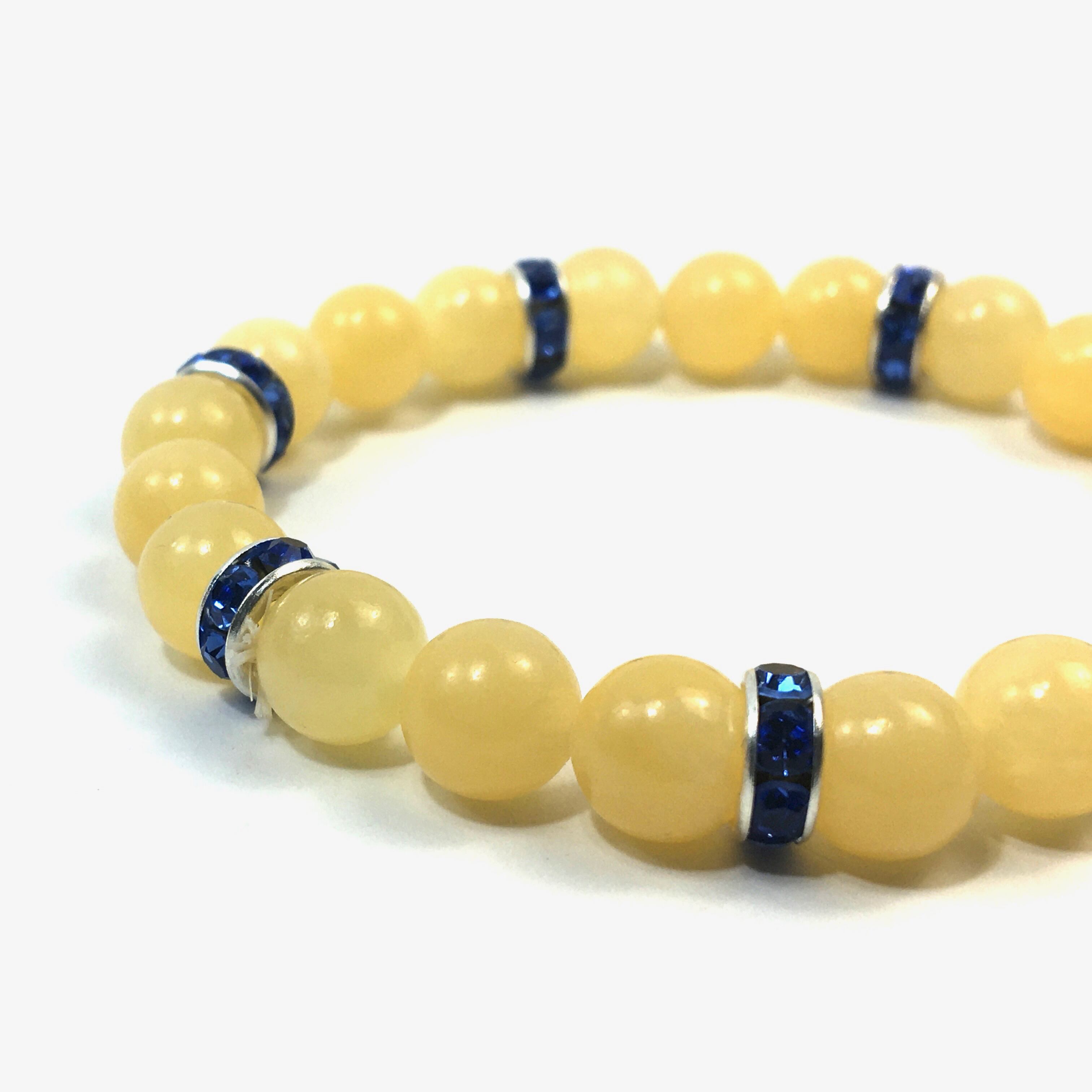 こちらは、8mm玉のアラゴナイトを使ったパワーストーンブレスレットです。シンプルなデザインでどんなコーディネートにも合わせやすいデザインに仕上げています。サイズは内周約15cmです。気になる方は是非この機会にどうぞ。