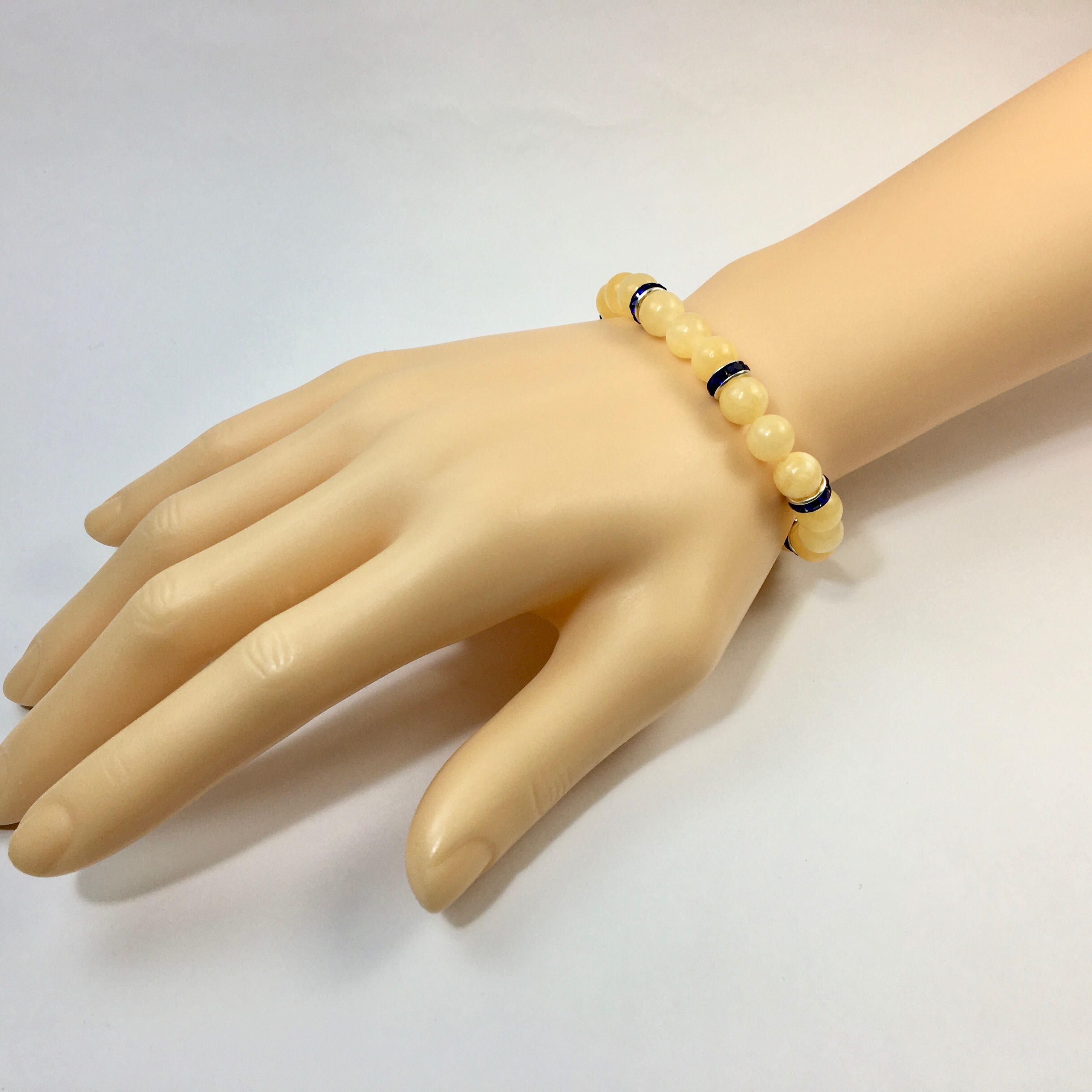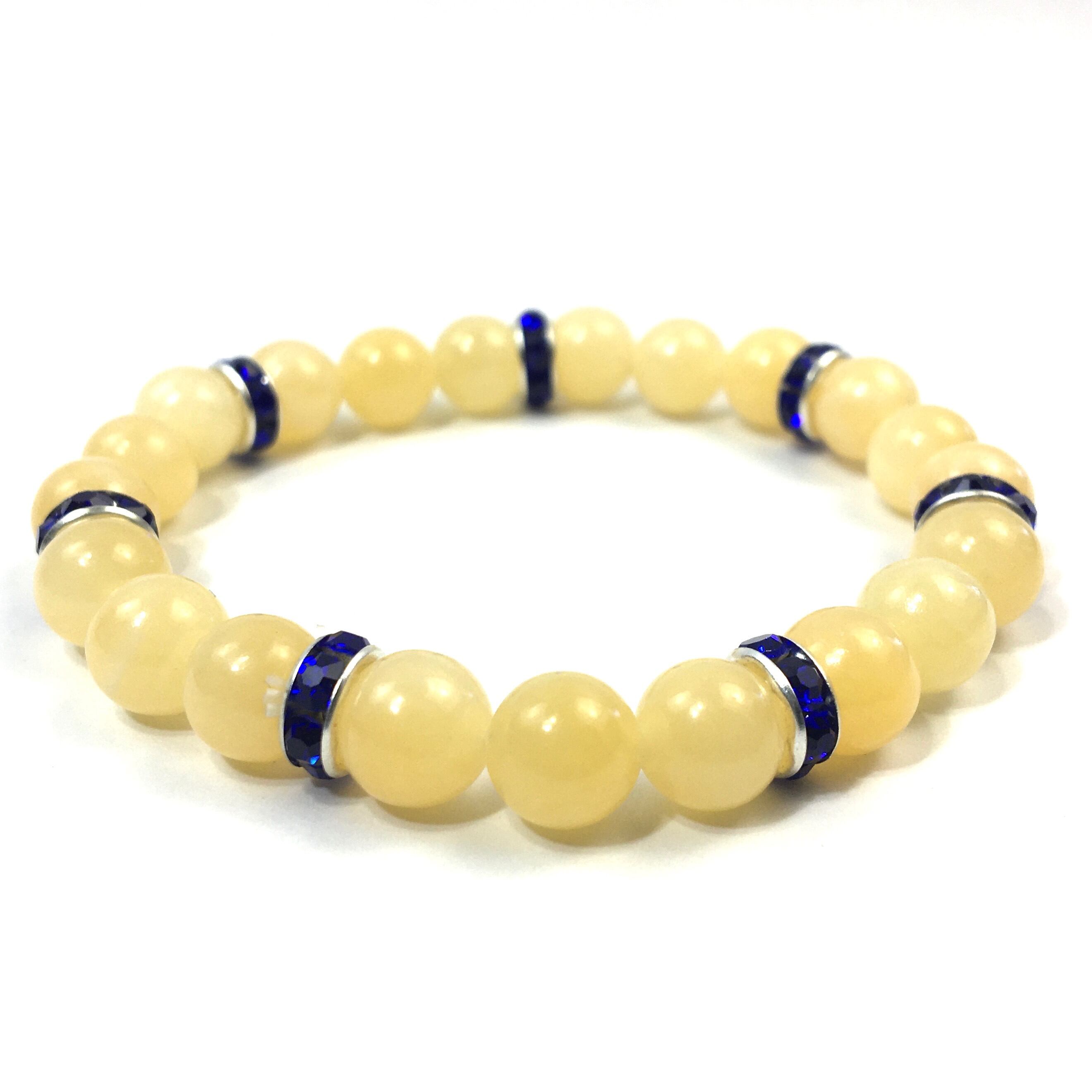こちらは、8mm玉のアラゴナイトを使ったパワーストーンブレスレットです。シンプルなデザインでどんなコーディネートにも合わせやすいデザインに仕上げています。サイズは内周約15cmです。気になる方は是非この機会にどうぞ。