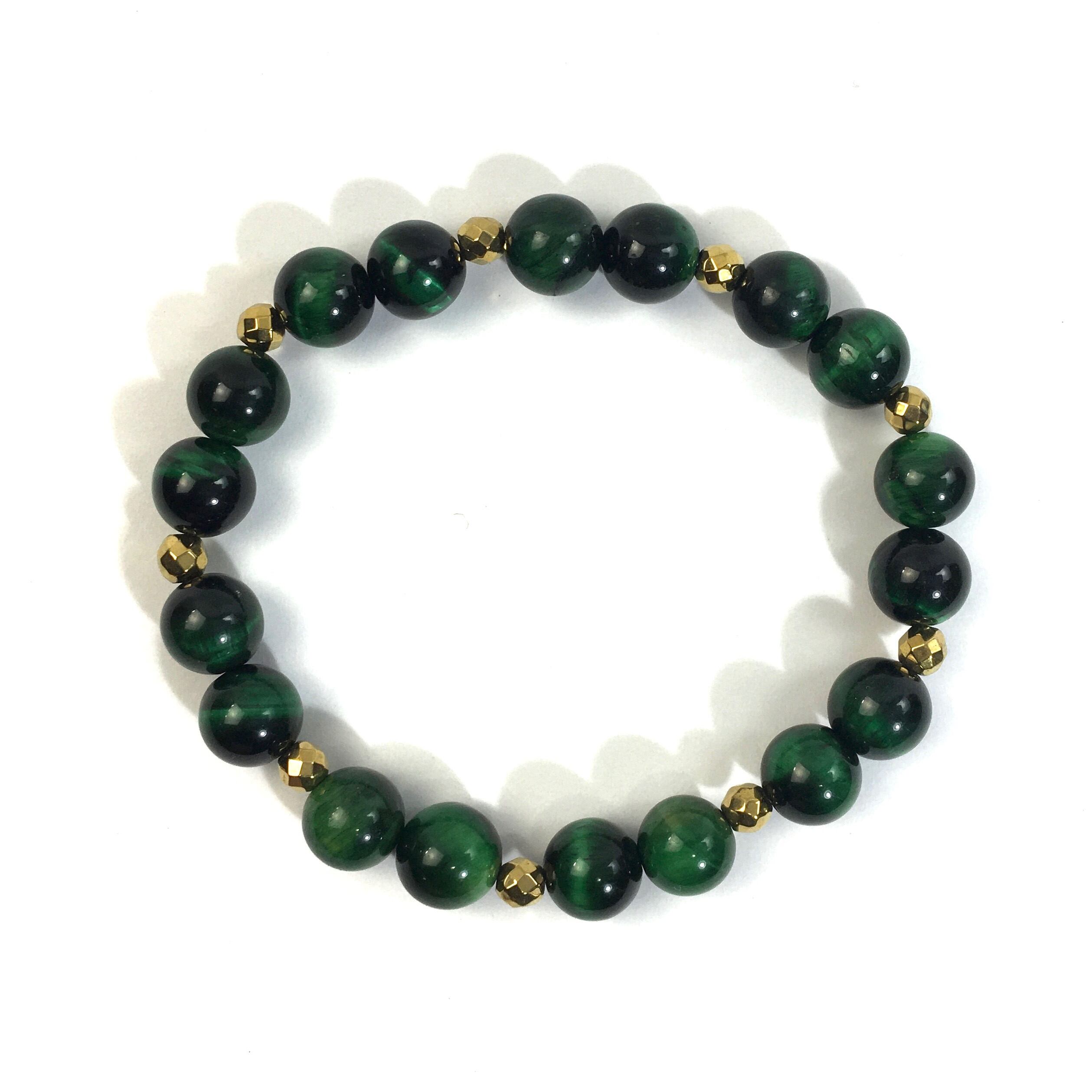 こちらは、8mm玉のグリーンタイガーアイを使ったパワーストーンブレスレットです。今回は石との間にはゴールドのヘマタイトを加えアクセントとしております。シンプルなデザインでどんなコーディネートにも合わせやすいデザインに仕上げています。サイズは内周約15cmです。気になる方は是非この機会にどうぞ。
