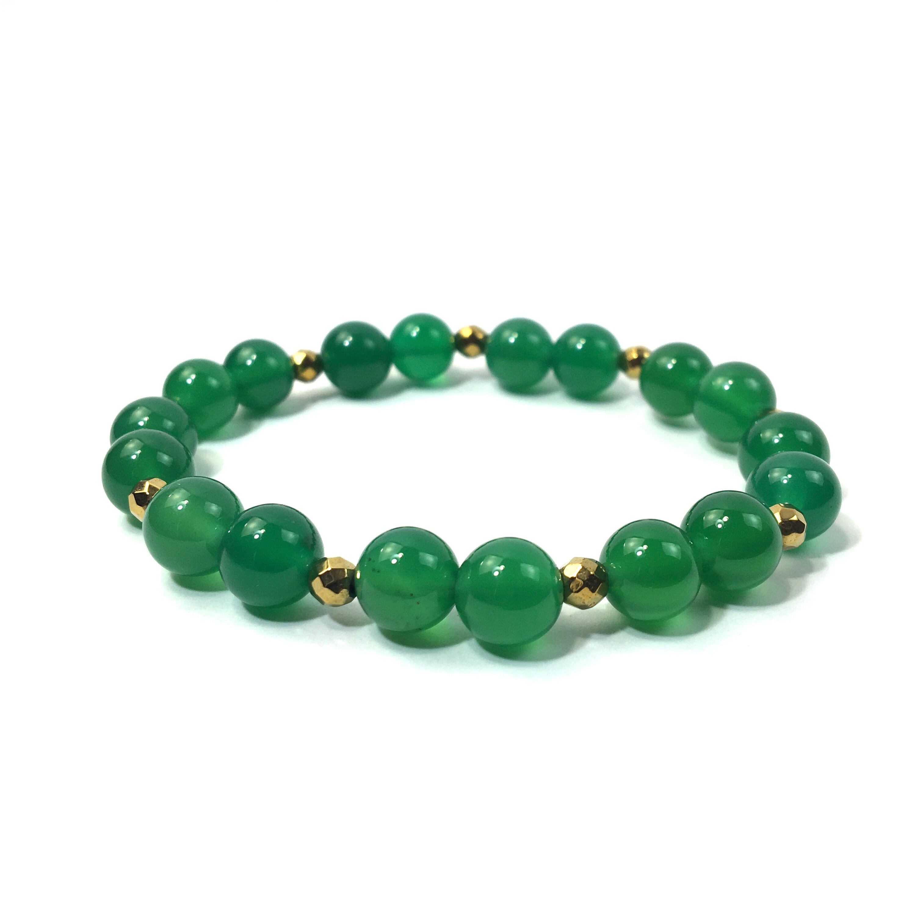 こちらは、8mm玉の緑瑪瑙を使ったパワーストーンブレスレットです。今回は石との間にはゴールドのヘマタイトを加えアクセントとしております。シンプルなデザインでどんなコーディネートにも合わせやすいデザインに仕上げています。サイズは内周約15cmです。気になる方は是非この機会にどうぞ。