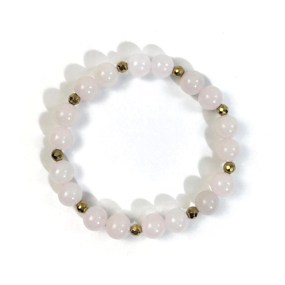 こちらは、8mm玉のローズクォーツを使ったパワーストーンブレスレットです。今回は石との間にはゴールドのヘマタイトを加えアクセントとしております。シンプルなデザインでどんなコーディネートにも合わせやすいデザインに仕上げています。サイズは内周約15cmです。気になる方は是非この機会にどうぞ。