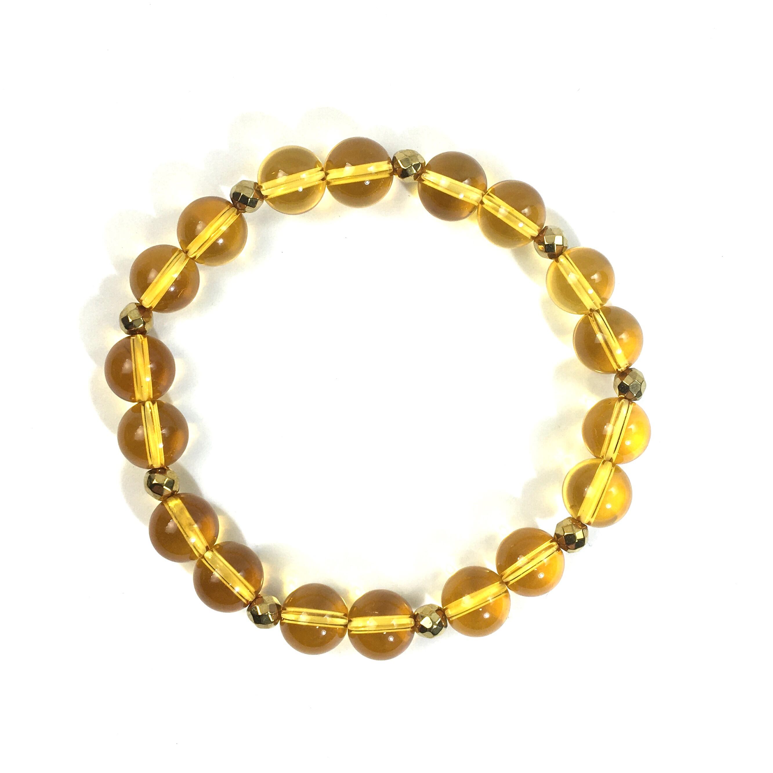 こちらは、8mm玉のシトリンを使ったパワーストーンブレスレットです。今回は石との間にはゴールドのヘマタイトを加えアクセントとしております。シンプルなデザインでどんなコーディネートにも合わせやすいデザインに仕上げています。サイズは内周約15cmです。気になる方は是非この機会にどうぞ。