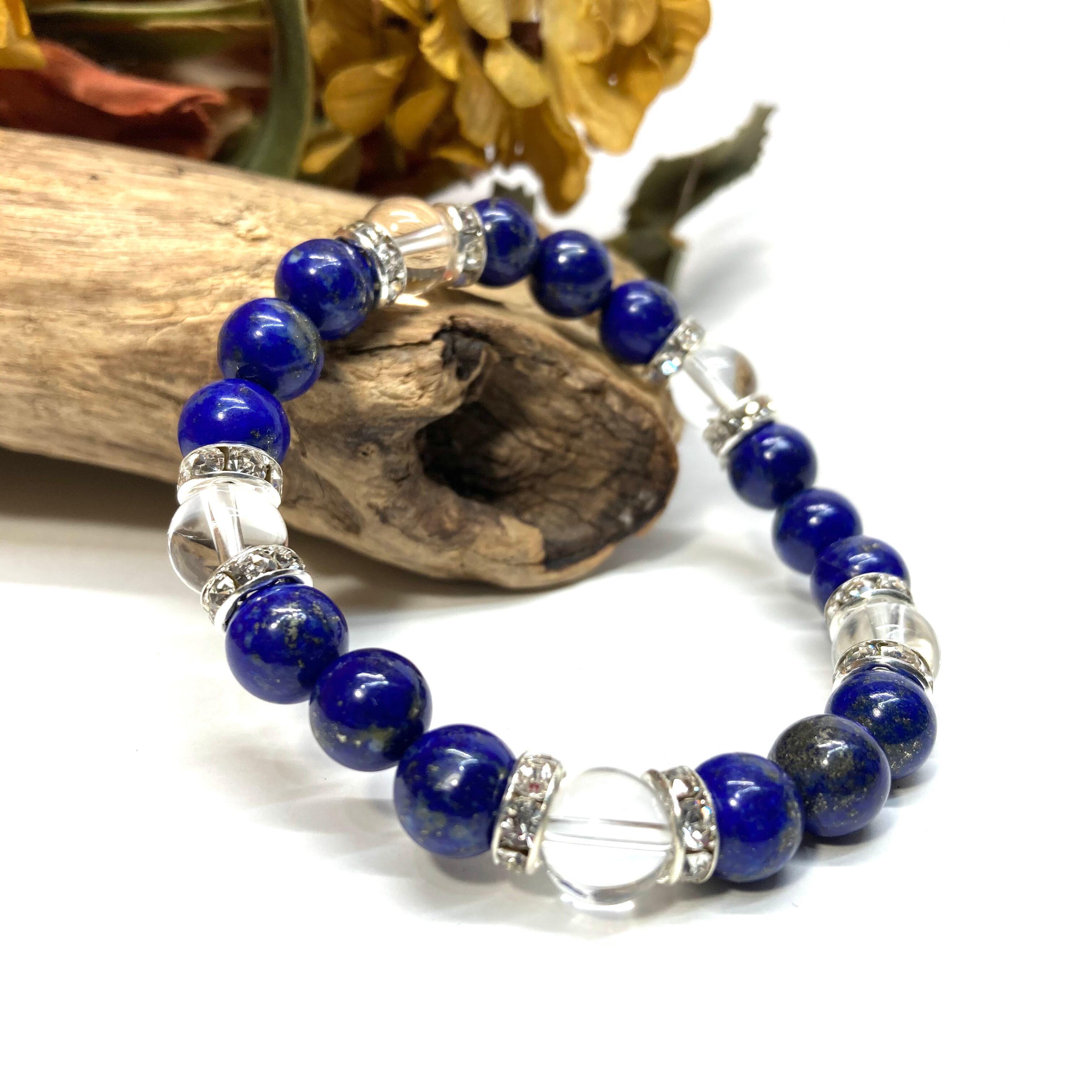 こちらは、8mm玉のラピスラズリと水晶を使ったパワーストーンブレスレットです。シンプルなデザインでどんなコーディネートにも合わせやすいデザインに仕上げています。サイズは内周約15cmです。気になる方は是非この機会にどうぞ。