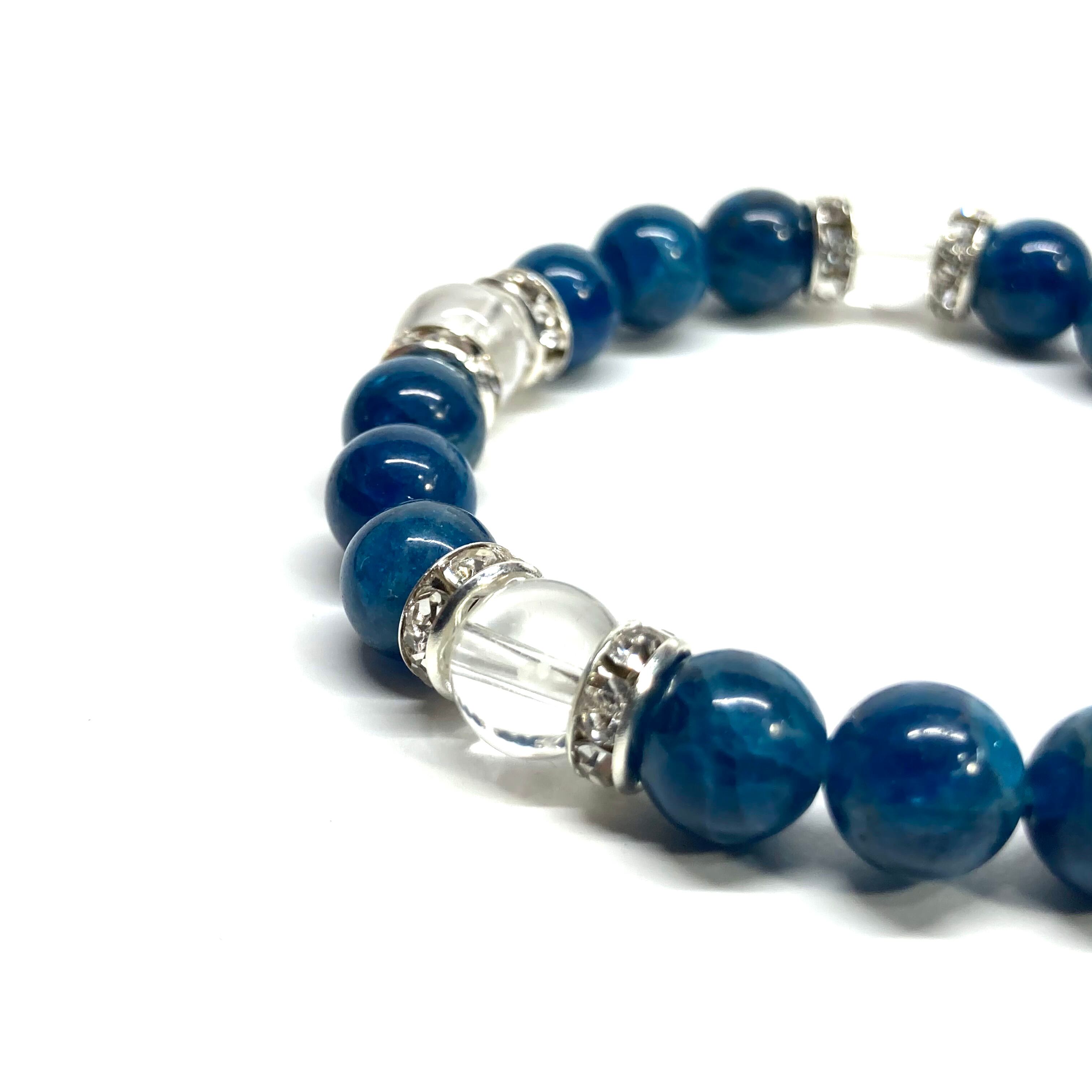 こちらは、8mm玉のアパタイトと水晶を使ったパワーストーンブレスレットです。シンプルなデザインでどんなコーディネートにも合わせやすいデザインに仕上げています。サイズは内周約15cmです。気になる方は是非この機会にどうぞ。