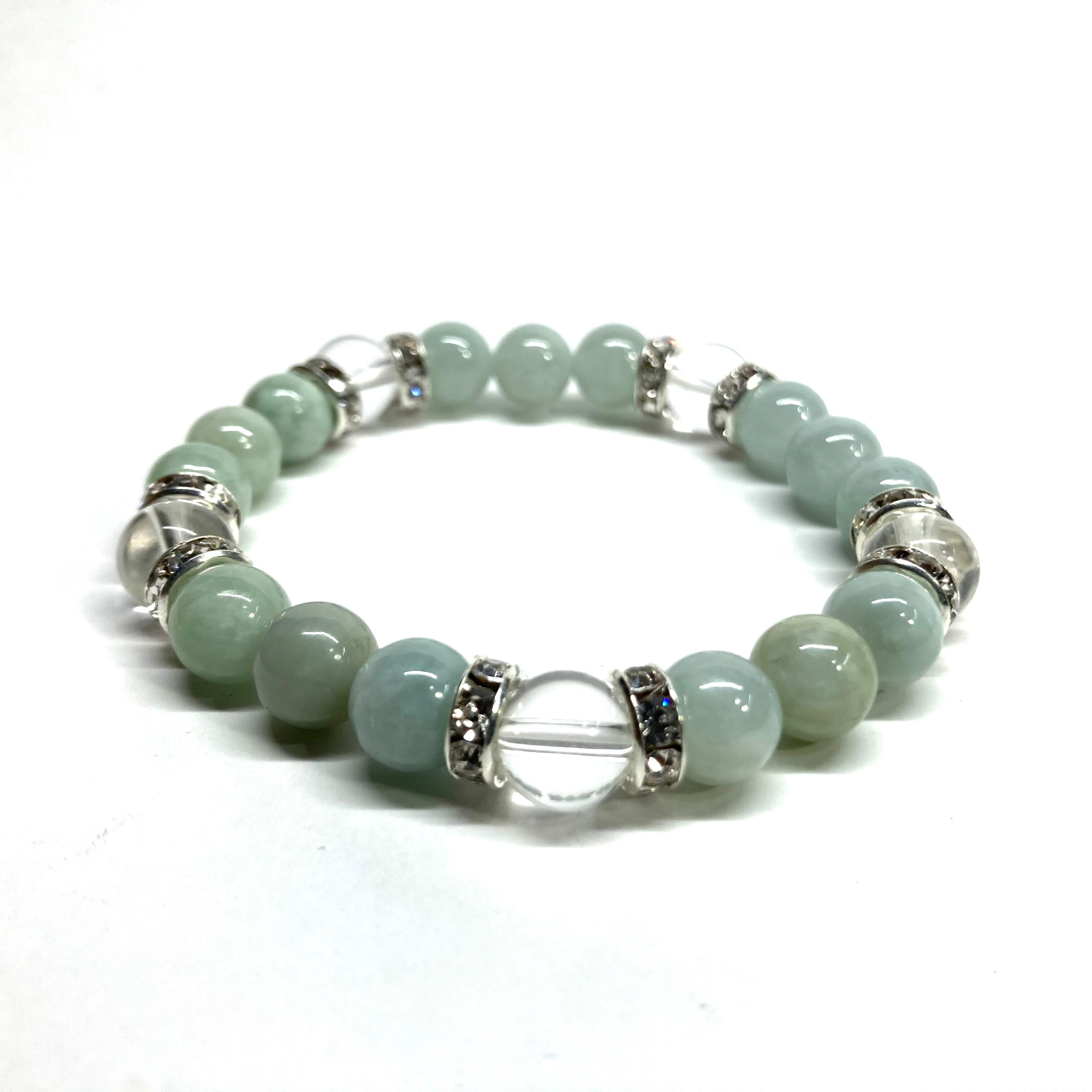 こちらは、8mm玉のビルマ翡翠と水晶を使ったパワーストーンブレスレットです。シンプルなデザインでどんなコーディネートにも合わせやすいデザインに仕上げています。サイズは内周約15cmです。気になる方は是非この機会にどうぞ。