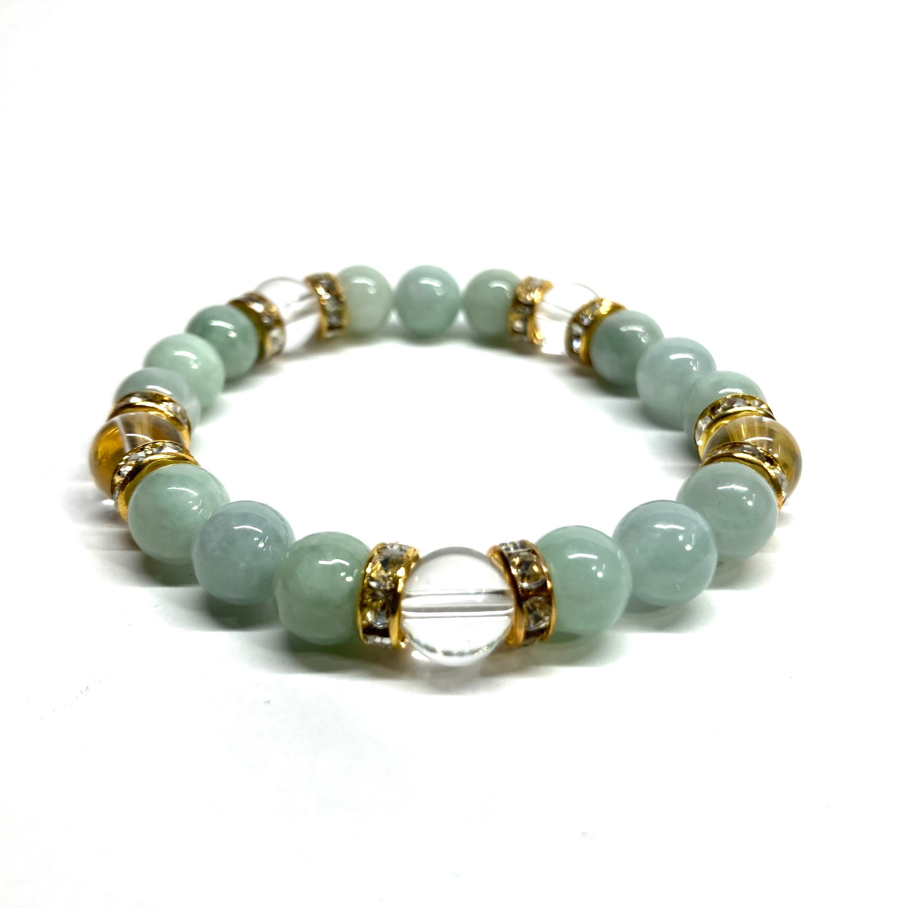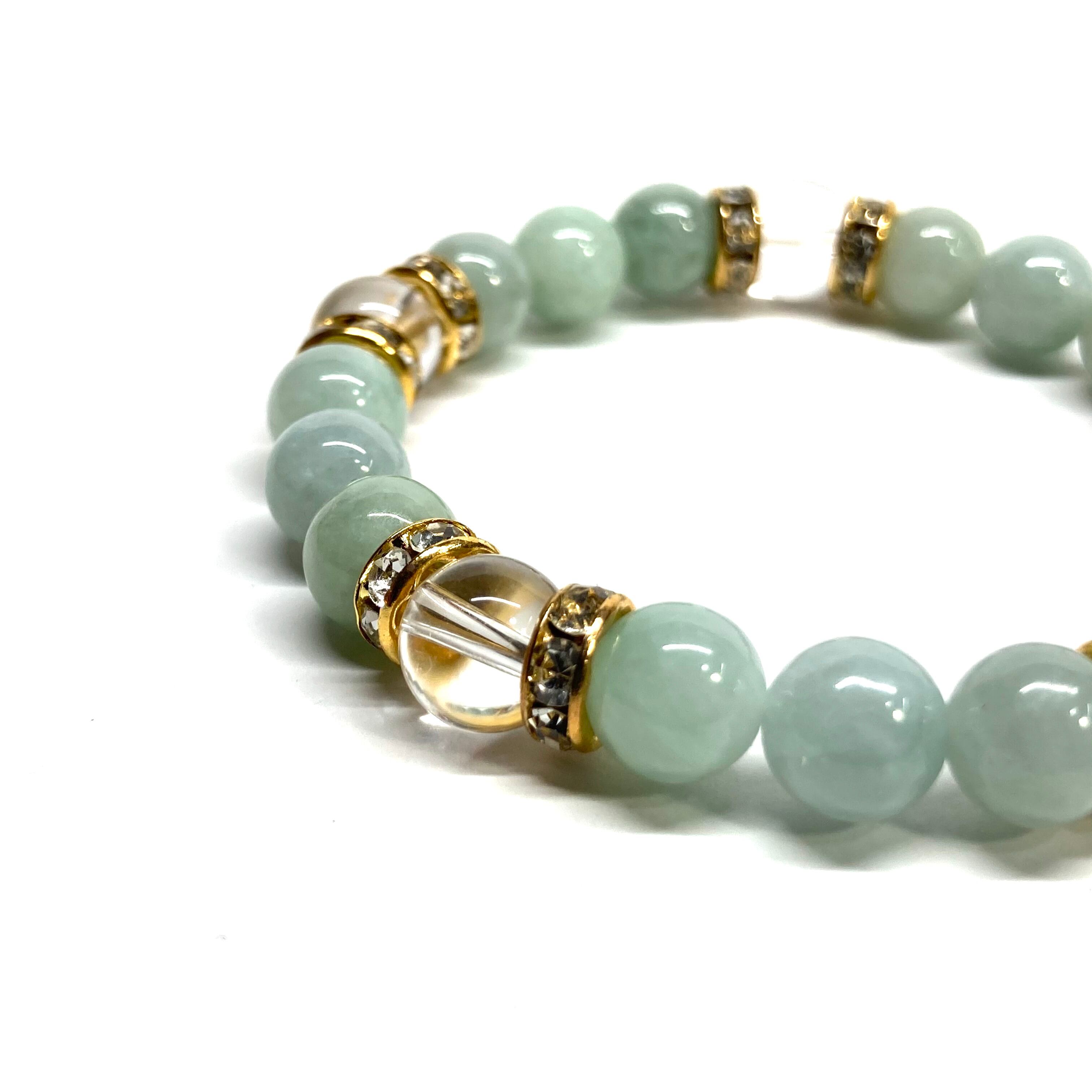 こちらは、8mm玉のビルマ翡翠と水晶を使ったパワーストーンブレスレットです。シンプルなデザインでどんなコーディネートにも合わせやすいデザインに仕上げています。サイズは内周約15cmです。気になる方は是非この機会にどうぞ。