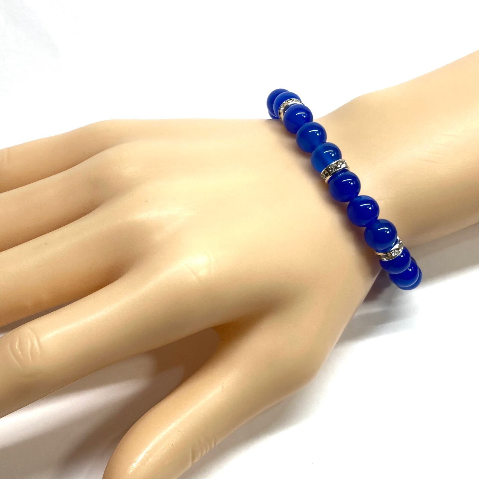 こちらは、8mm玉の青瑪瑙を使ったパワーストーンブレスレットです。シンプルなデザインでどんなコーディネートにも合わせやすいデザインに仕上げています。サイズは内周約15cmです。気になる方は是非この機会にどうぞ。