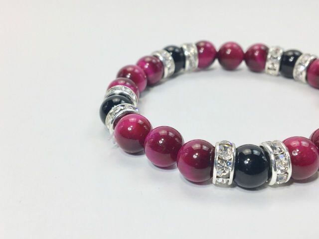 こちらは、8mm玉のピンクタイガーアイとオニキスを使ったパワーストーンブレスレットです。シンプルなデザインでどんなコーディネートにも合わせやすいデザインに仕上げています。サイズは内周約15cmです。気になる方は是非この機会にどうぞ。