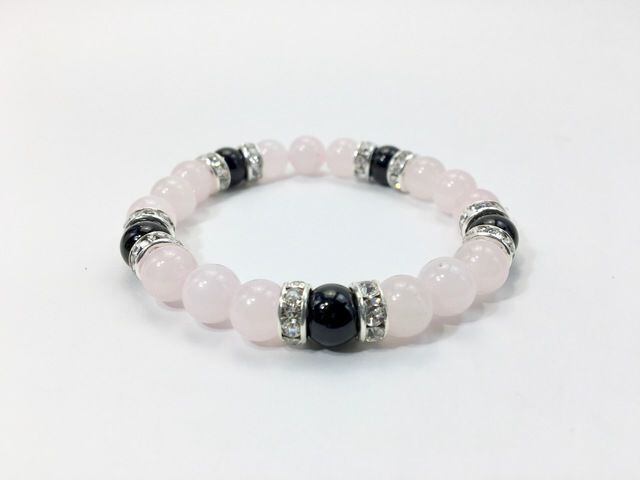 こちらは、8mm玉のローズクォーツとオニキスを使ったパワーストーンブレスレットです。シンプルなデザインでどんなコーディネートにも合わせやすいデザインに仕上げています。サイズは内周約15cmです。気になる方は是非この機会にどうぞ。
