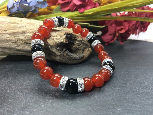 こちらは、8mm玉の赤瑪瑙とオニキスを使ったパワーストーンブレスレットです。シンプルなデザインでどんなコーディネートにも合わせやすいデザインに仕上げています。サイズは内周約15cmです。気になる方は是非この機会にどうぞ。