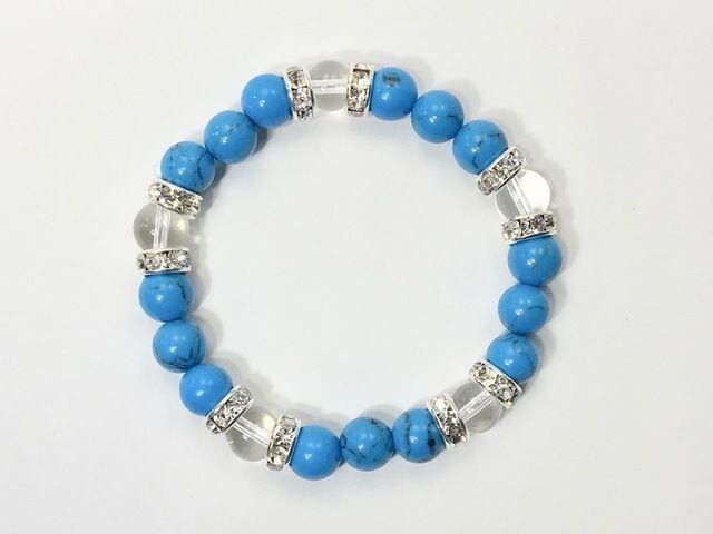 こちらは、8mm玉のターコイズと水晶を使ったパワーストーンブレスレットです。シンプルなデザインでどんなコーディネートにも合わせやすいデザインに仕上げています。サイズは内周約15cmです。気になる方は是非この機会にどうぞ。