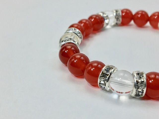 こちらは、8mm玉の赤瑪瑙と水晶を使ったパワーストーンブレスレットです。シンプルなデザインでどんなコーディネートにも合わせやすいデザインに仕上げています。サイズは内周約15cmです。気になる方は是非この機会にどうぞ。