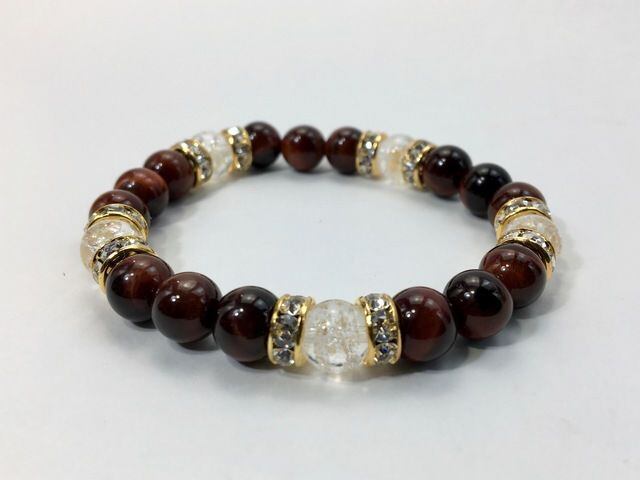 こちらは、8mm玉のレッドタイガーアイとクラック水晶を使ったパワーストーンブレスレットです。シンプルなデザインでどんなコーディネートにも合わせやすいデザインに仕上げています。サイズは内周約15cmです。気になる方は是非この機会にどうぞ。