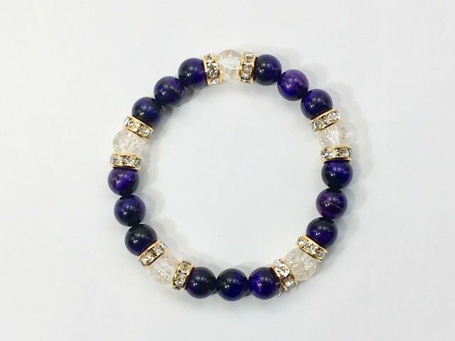 こちらは、8mm玉のパープルタイガーアイとクラック水晶を使ったパワーストーンブレスレットです。シンプルなデザインでどんなコーディネートにも合わせやすいデザインに仕上げています。サイズは内周約15cmです。気になる方は是非この機会にどうぞ。