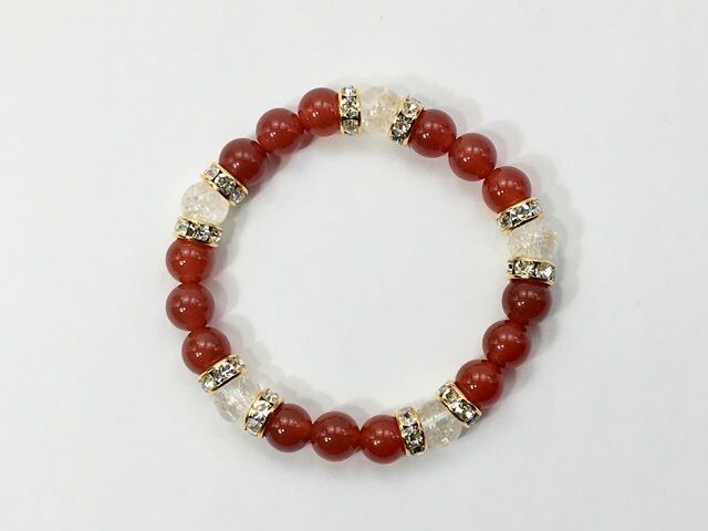 こちらは、8mm玉の赤瑪瑙とクラック水晶を使ったパワーストーンブレスレットです。シンプルなデザインでどんなコーディネートにも合わせやすいデザインに仕上げています。サイズは内周約15cmです。気になる方は是非この機会にどうぞ。