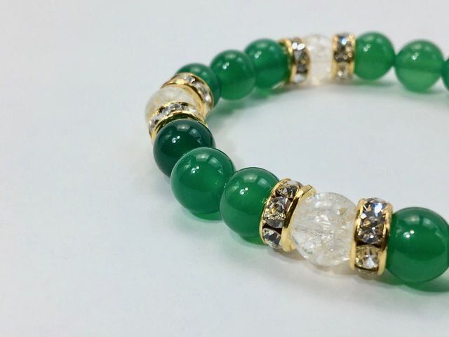 こちらは、8mm玉の緑瑪瑙とクラック水晶を使ったパワーストーンブレスレットです。シンプルなデザインでどんなコーディネートにも合わせやすいデザインに仕上げています。サイズは内周約15cmです。気になる方は是非この機会にどうぞ。