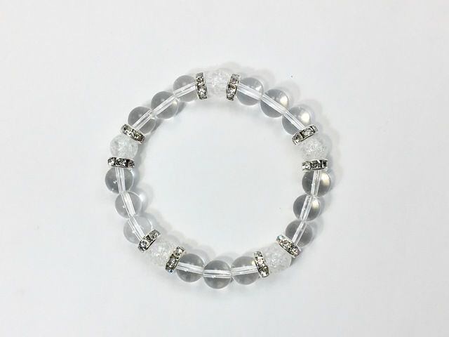 こちらは、8mm玉の水晶とクラック水晶を使ったパワーストーンブレスレットです。シンプルなデザインでどんなコーディネートにも合わせやすいデザインに仕上げています。サイズは内周約15cmです。気になる方は是非この機会にどうぞ。