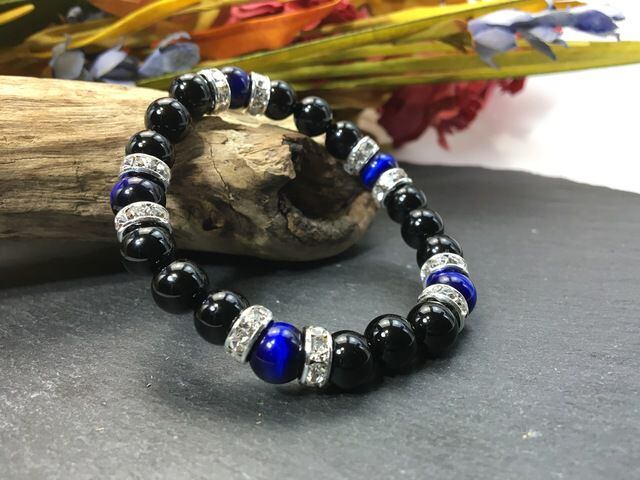 こちらは、8mm玉のオニキスとブルータイガーアイを使ったパワーストーンブレスレットです。シンプルなデザインでどんなコーディネートにも合わせやすいデザインに仕上げています。サイズは内周約15cmです。気になる方は是非この機会にどうぞ。