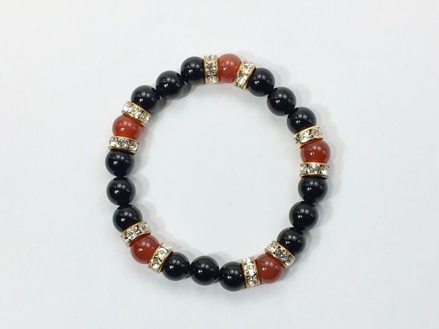 こちらは、8mm玉のオニキスと赤瑪瑙を使ったパワーストーンブレスレットです。シンプルなデザインでどんなコーディネートにも合わせやすいデザインに仕上げています。サイズは内周約15cmです。気になる方は是非この機会にどうぞ。