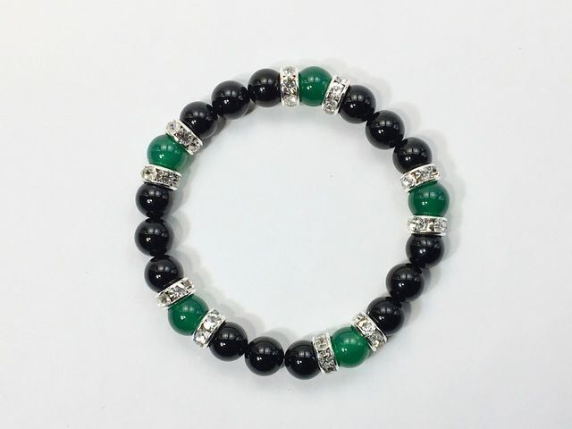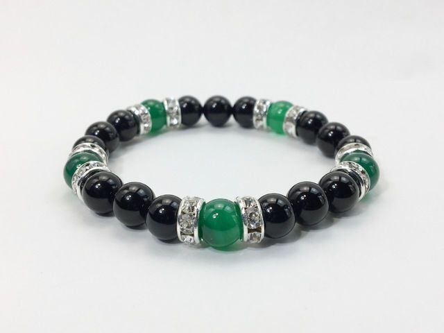 こちらは、8mm玉のオニキスと緑瑪瑙を使用した天然石ブレスレットです。間にはロンデルを挟み高級感ある仕上がりです。石大きさは腕にも馴染みやすいように8mm玉で内周約15cm(伸可能)です。気になる方は是非この機会にどうぞ。