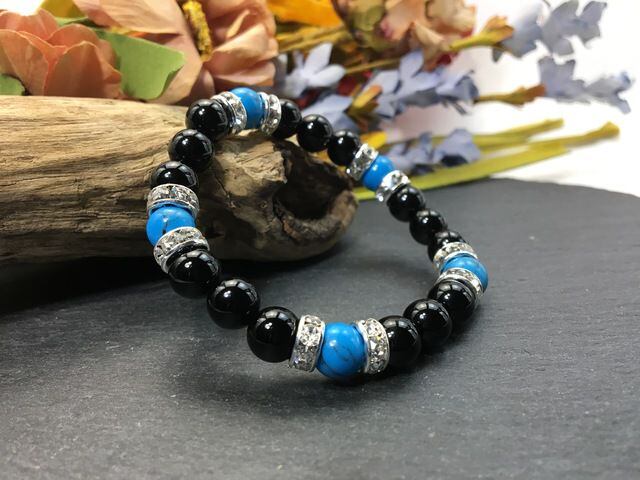 こちらは、8mm玉のオニキスとターコイズを使ったパワーストーンブレスレットです。シンプルなデザインでどんなコーディネートにも合わせやすいデザインに仕上げています。サイズは内周約15cmです。気になる方は是非この機会にどうぞ。