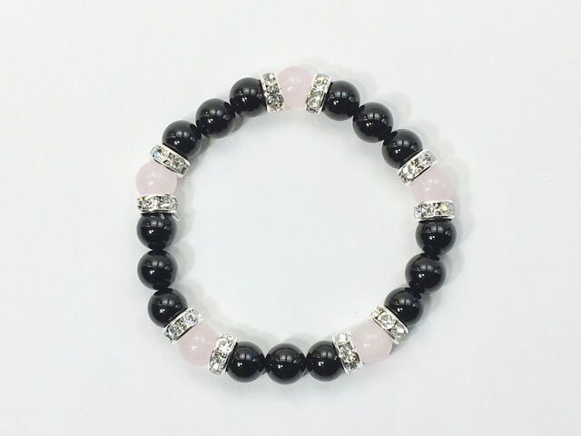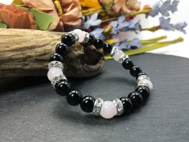 こちらは、8mm玉のオニキスとローズクォーツを使ったパワーストーンブレスレットです。シンプルなデザインでどんなコーディネートにも合わせやすいデザインに仕上げています。サイズは内周約15cmです。気になる方は是非この機会にどうぞ。