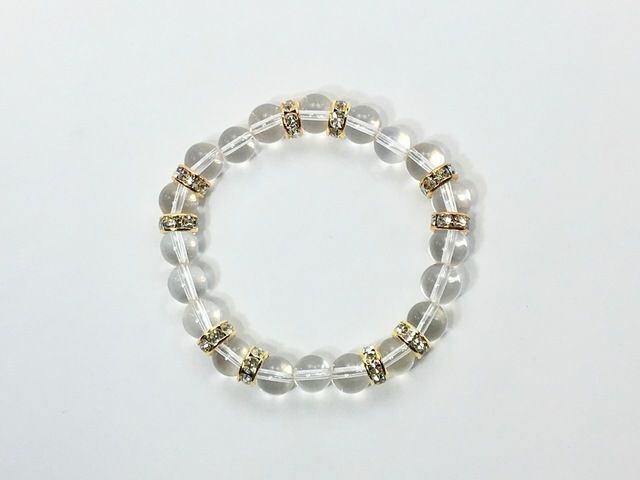 こちらは、8mm玉の水晶を使ったパワーストーンブレスレットです。シンプルなデザインでどんなコーディネートにも合わせやすいデザインに仕上げています。サイズは内周約15cmです。気になる方は是非この機会にどうぞ。