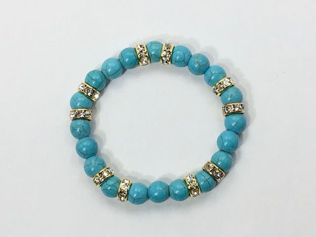 こちらは、8mm玉のターコイズを使ったパワーストーンブレスレットです。シンプルなデザインでどんなコーディネートにも合わせやすいデザインに仕上げています。サイズは内周約14cmです。気になる方は是非この機会にどうぞ。