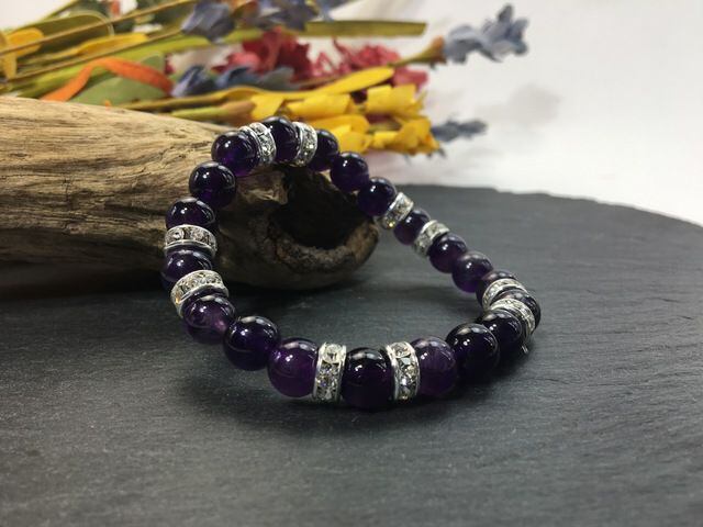 こちらは、8mm玉のアメジストを使ったパワーストーンブレスレットです。シンプルなデザインでどんなコーディネートにも合わせやすいデザインに仕上げています。サイズは内周約15cmです。気になる方は是非この機会にどうぞ。